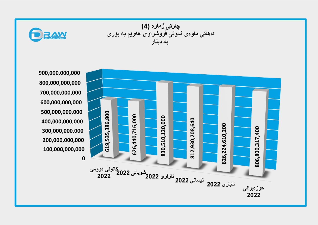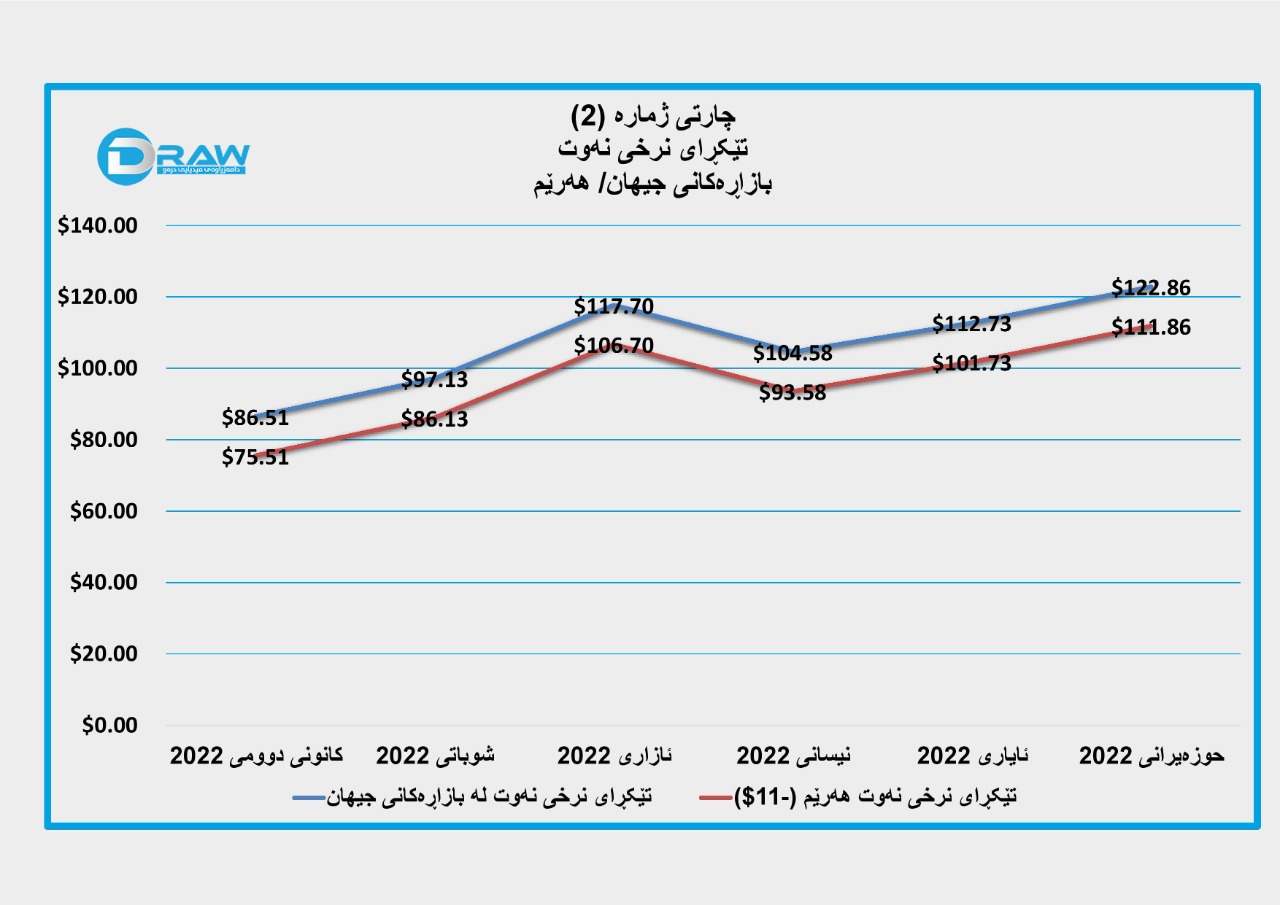 - ئەمە بۆ مانگەکانی (نیسان، ئایار و حوزەیران)یش ڕاستە، کاتێک نرخی نەوت لەمانگی نیسان (104.58) دۆلار بووە گریمانەی ئەوە کراوە بەهای بەرمیلێکی نەوتی هەرێم بە (94) دۆلار و لە مانگی ئایار (101.73) دۆلار بووە و نەوتی هەرێم بە (91) دۆلار و لەمانگی حوزەیرانیش بە تێکڕا (122.86) دۆلار بووەو ئەوەی هەرێمی کوردستانیش بەرمیلێکی بە بڕی (111) دۆلار فرۆشراوە. (چارتی ژمارە (2))
