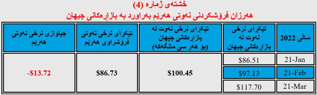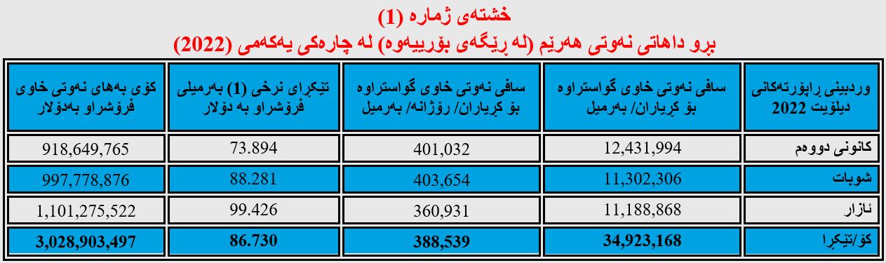 تێبینی/ ئەگەر تێکڕای نرخی نەوتی فرۆشراوی سێ مانگی یەکەمی (2022) وەربگرین، وەک لە ڕاپۆرتەکەی دیلۆیت ئاماژەی پێدراوە ئەوا نرخی هەر بەرمیلێک بریتی دەبێت لە (87.2) دۆلار نەک (86.73) دۆلار، کۆی داهاتەکەشی (3 ملیار و 45 ملیۆن و 311 هەزار و 891) دۆلار دەبێت نەک (3 ملیار و 28 ملیۆن و 903 هەزار و 497) دۆلار، بەڵام لە خشتەکەدا هەمان ئەو ئەنجامەمان داناوە کە دیلۆیت ئاماژەی پێداوە، چونکە وەک ڕاپۆرتەکەی دیلۆیت ئاماژەی پێداوە بەشێک لە نەوتەکە لە کارگۆی نەوتی بێ مواسەفات و ئاو بە هەرزانتر فرۆشراوە.