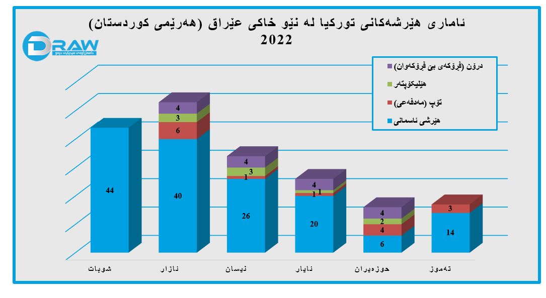 - مانگی ئازاری 2022؛ (40) هێرشی ئاسمانی، (6) هاویشتنی تۆپ، (3) هێرشی هێلیکۆپتەر، (4) فڕۆکەی بێ فڕۆکەوان.