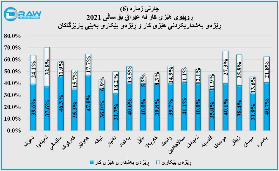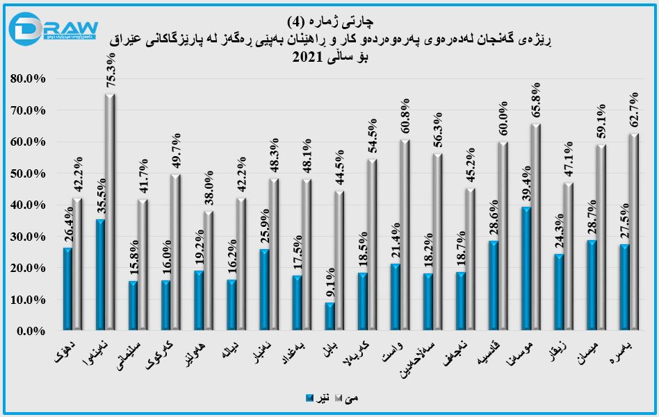 # بە تێکڕا لە ڕووی بەشداری هێزی کارەوەلەسەر ئاستی عێراق پارێزگای هەولێر گەورەترین بەشداری هەیەو ڕێژەکەی دەگاتە (47%)، لەدوای ئەویش پارێزگای سلێمانی دێت بە (46.3%) و دواین پارێزگاش ئەنبار دێت بە (31.7%).