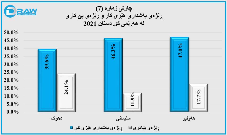 - پارێزگای هەوڵێر (47%) هێزی کاری تێدا بەگەڕخراوەو لەسەر ئاستی عێراق و هەرێم لە پلەی یەکەمدایە، بەڵام لە ڕووی بێ کارییەوە لە سەر ئاستی هەرێم بە پلەی دووەم دێت و (17.7%)ی هێزی کاری تێدا بێ کارە.