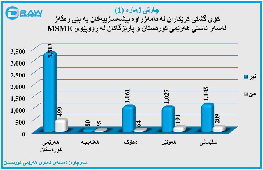 زۆر بچووك (2 ههزار و 976)، بچووك (656) و مامناوەند (14) كرێكار، كە (3 ههزار و 313) به ڕێژهی (86.9%) له ڕەگەزی نێرن و (499) کهسیان به ڕێژهی (13%) لە ڕەگەزی مێینهن. (بڕوانه چارتی ژماره (1)).