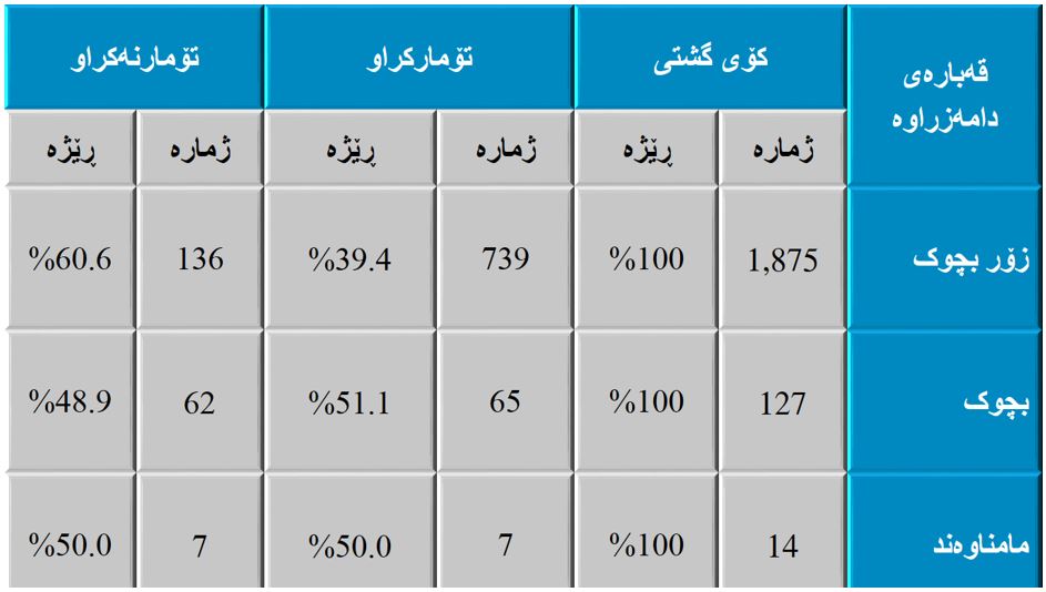 # لە کۆی (2 ههزار 16) دامەزراوهی زۆر بچوک، بچوک و مامناوەند، تەنها (811)یان به ڕێژهی (40.2%) بە فەرمی تۆماركراوون و (ههزار و 205) یان به ڕێژهی (59.7%) لە هیچ شوێنێكی فەرمی تۆمار نەكراوون.