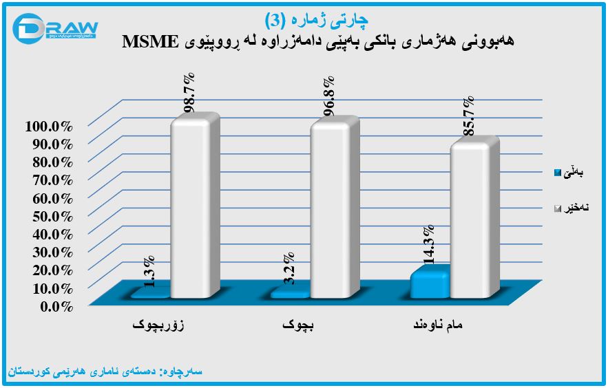 4. بەكارهێنانی خزمەتگوزاری بانكی: بە پێی ئەنجامەكانی ڕووپێویMSME ، دەرکەوتووە کە زۆرینەی دامەزراوەکان (ههزار و 985)یان هەژماری بانکییان نییە بهڕێژهی (98.5%) و تەنیا (1.5%)ی دامەزراوەکان هەژماری بانکییان هەیە، كە ژمارهیان (31) دامەزراوهیە. لە ڕووی هەبوونی ژمارەی بانكی، جیاوازییەكی بەرچاو لە نێوان دامەزراوەكانی زۆر بچوك و بچووك و مامناوەند ههیە، چونکە ئەم ڕێژەیە لە (1.3%) بۆ دامەزراوەی زۆر بچووك بۆ (3.2%) بۆ دامەزراوەی بچووک و (14.3%) بۆ دامەزراوەی مامناوەند زیاد دەکات. سهبارهت به هەبوونی هەژماری بانكی بەپێی دامەزراوە لە ڕووپێوی MSME (بڕوانه چارتی ژماره (3)).
