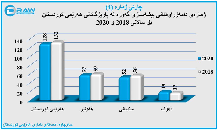 لە سەر ئاستی پارێزگاکانیش ژمارەی دامەزراوەکان لە پارێزگای هەولێر لە (59) دامەزراوە لە ساڵی 2018 دابەزیوە بۆ (57) دامەزراوە لە ساڵی 2020 کە زۆرترین رێژەی دامەزراوەكانی گەورە بە ڕێژەی (44%)ی لە خۆگرتووە. لە پارێزگای سلێمانی لە (56) دامەزراوە لە ساڵی 2018 دابەزیوە بۆ (52) دامەزراوە لە ساڵی 2020 بە پلەی دووەم دێت بە ڕێژەی (41%). بهڵام لە پارێزگای دهۆک لە (17) دامەزراوە لە ساڵی 2018 بەرزبۆتەوە بۆ (19) دامەزراوە لە ساڵی 2020 کە رێژەکەی دەکاتە (15%). تاینبهت به ژمارەی دامەزراوەكانی پیشەسازی گەورە لە پارێزگاكانی هەرێمی كوردستان بۆ ساڵانی 2018 و 2020 (بڕوانه چارتی ژماره (4))