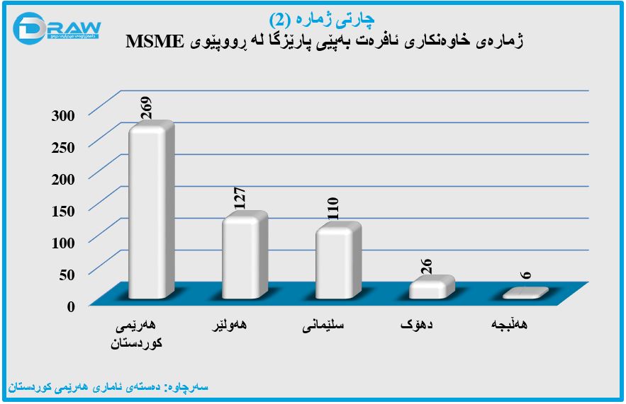 3. ژمارەی خاوەنكارەكان: ڕووپێوەكەی ئێستای هەرێمی کوردستان بۆ ساڵی 2020 دەریدەخات کە هێشتا ژنان کەمینەن لە خاوەندارێتی دامەزراوەكانی زۆر بچووك و بچووك و مامناوەند. لە كۆی گشتی (2 ههزار و 16) خاوەنكار، ژمارەی خاوەنكاری ژن (269) کهسن به ڕێژهی (13.3%)، بە بەراوورد بە (ههزار و 747) خاوەنكاری پیاو بهڕێژهی (86.6%). لە كۆی گشتی (269) خاوەنكاری ژن، (262) لە دامەزراوەی زۆر بچووك، (6) كەس لە دامەزراوەی بچووك و (1) كەس و دامەزراوەی مامناوەند خاوەنكارن. جێگهی ئاماژهیه كە زۆربەی ئەو دامەزراوانەی كە ژنان خاوەندارن لە هیچ شوێنێكی فەرمی تۆمار نەكراوون. تۆمارکراو (37) بە ڕێژەی (1.8%، تۆمارنەکراو (232) بە ڕێژەی (11.5%))، لهسهر ئاستی پارێزگاکان (بڕوانه چارتی ژماره (2)).