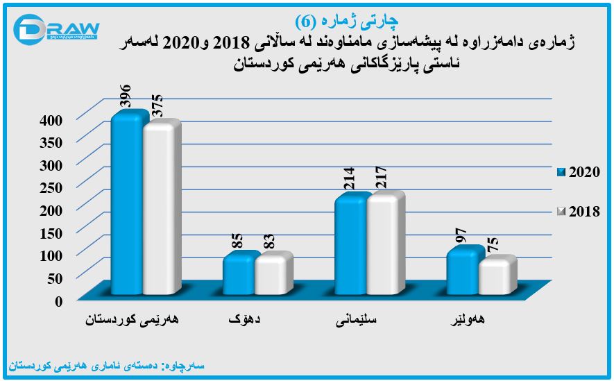 1. ژمارەی دامەزراوەكان: بەپێی ئەنجامەكانی رووپێوی دامەزراوەی پیشەسازی مامناوەند دەركەوتووە كە ژمارەی دامەزراوەكان کە لە ساڵی 2020 کار دەکەن (396) دامەزراوەن بەبەراورد بە ژمارەی ئەو دامەزراوانەی کە لە ساڵی 2018 کاریان دەكرد كە ژمارهیان (375) دامەزراوە بووە، واتە ژمارەی دامەزراوەی مامناوەند بەرێژەی (5.6%) لە هەرێمی كوردستان زیادیكردووە بەبەراورد بە ساڵی 2018. لەسەر ئاستی پارێزگاكانی هەرێمی كوردستان هەر چەندە کە پارێزگای سلێمانی لە (217) دامەزراوە لە ساڵی 2018 کەمی کردووە بۆ (214) دامەزراوە لە ساڵی 2020، بهڵام زۆرترین رێژەی دامەزراوەی مامناوەند دەكەوێتە ئەم پارێزگایە بەرێژەی (54%) و هەروەها ژمارەی دامەزراوەكان لە پارێزگای هەولێر لە (75) دامەزراوەوه لە ساڵی 2018 بەرزبووتەوە بۆ (97) دامەزراوە لە ساڵی 2020 کە بە پلەی دووەم دێت بە رێژەی (25%) دامەزراوەکان. لە پارێزگای دهۆك لە (83) دامەزراوەوه لە ساڵی 2018 بەرزبووتەوە بۆ (85) دامەزراوە لەساڵی 2020 و رێژەی دامەزراوەکان دەگاتە (21%)ی دامەزراوەکان لە هەرێمدا. لهم بارهیهوه (بڕوانه چارتی ژماره (6)).