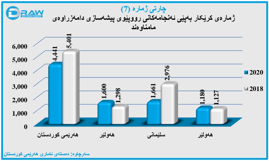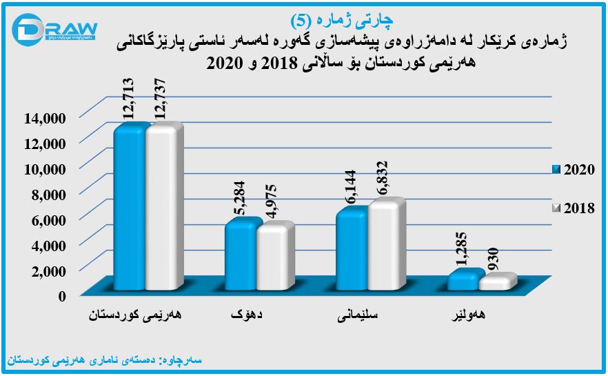 لەسەر ئاستی پارێزگاكانیش ژمارەی كرێكاران لە پارێزگای هەولێر لە (ههزار و 298) كرێكار لە ساڵی 2018 بەرزبۆتەوە بۆ (ههزار و 600) كرێكار لە ساڵی 2020. لە پارێزگای سلێمانی لە (2 ههزار و 976) كرێكار لە ساڵی 2018 دابەزیوە بۆ (2 ههزار و 661) كرێكار لە ساڵی 2020. لە پارێزگای دهۆك لە (ههزار و 127) كرێكار لە ساڵی 2018 بەرزبۆتەوە بۆ (ههزار و 180) كرێكار لە ساڵی 2020. (بڕوانه چارتی ژماره (7)).