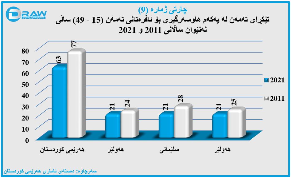 ئەم ئامارانە پشت بەستراوە بە ڕووپێوی بارودۆخی كۆمهڵایەتی و تەندروستی ئافرەتان (IWISH). گەڕی یەكەمی ئەم ڕووپێوە لەساڵی 2011 و گەڕی دووەم لە ساڵی 2021 لە هەرێمی كوردستان و عێراق بە گشتی ئەنجامدراوه لهلایەن دەستەی ئاماری هەرێمی كور دستان بە هاوبەشی لەگەڵ دەزگای ناوەندی ئاماری عێراق و بههەماهەنگی لەگەڵ سندوقی نەتەوە یەكگرتووەكان بۆ دانیشتوان (UNFPA). قەبارەی نموونەی هەڵبژێردراو لەم ڕووپێوە لەسەر ئاستی هەرێم لە (ههزار و 596) خێزان پێكهاتووهو بۆ هەر پارێزگایەك (532) خێزان بووه، لە هەردوو ژینگەی شارنشین و گوندنشین.