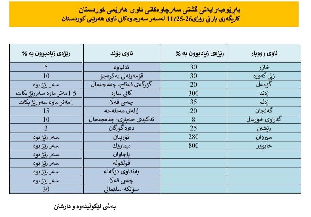 # شەپۆلی بارانی چەند رۆژی رابردوو، کاریگەری بەرچاوی لەسەر زیادبوونی سەرچاوەکانی ئاوی هەرێمی کوردستان، هەبووە، بەڵام لە ئاوی ژێر زەویدا هیچ زیادبوونێک تۆمار نەکراوە.