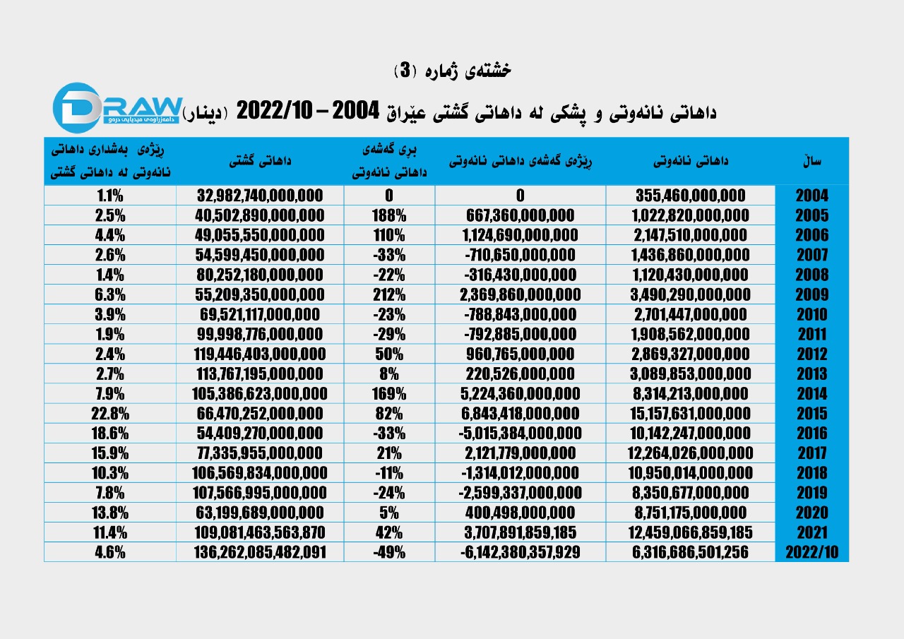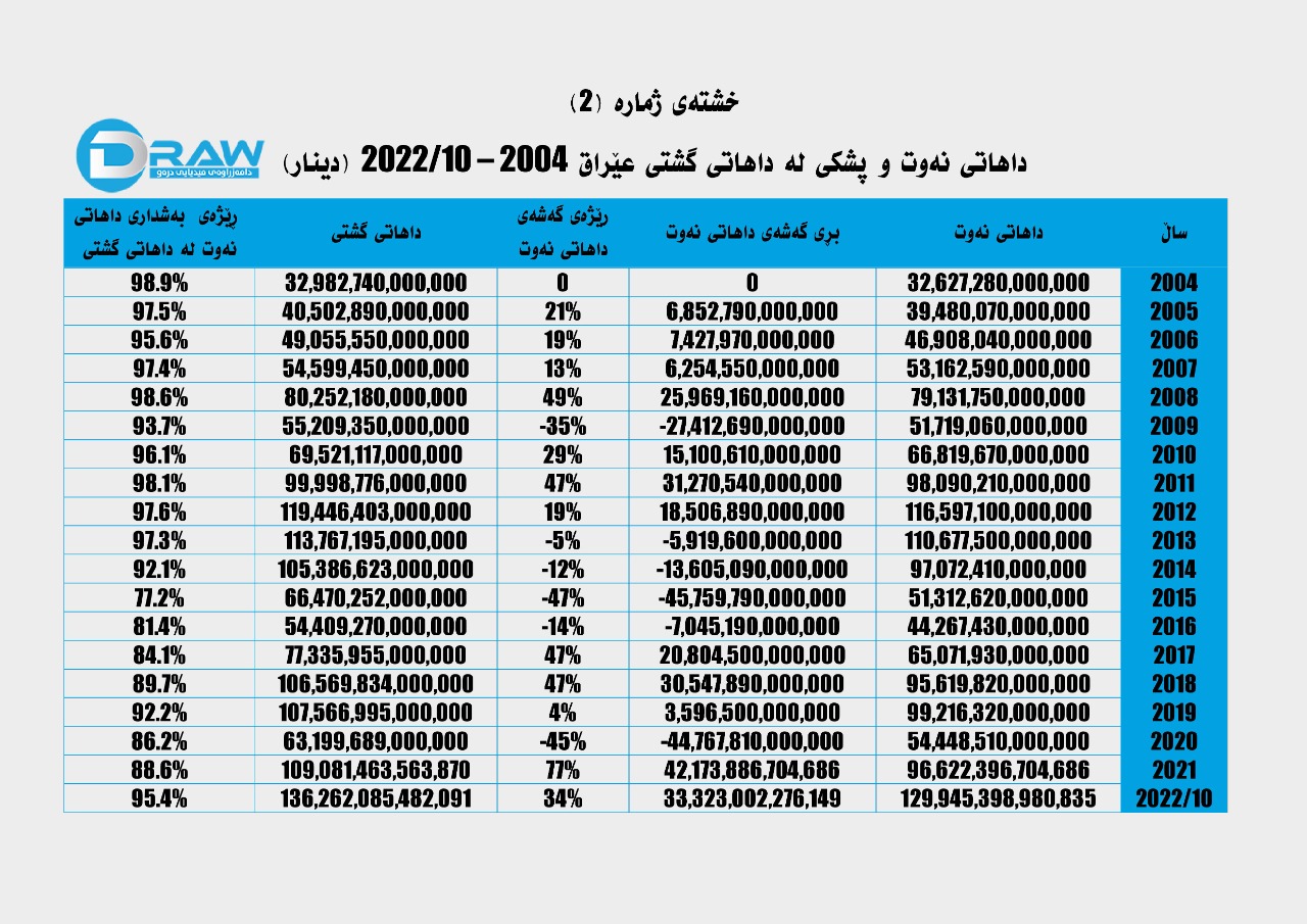 سێیەم؛ داهاتی نانەوتی و پشکی لە داهاتی گشتی عێراق (2004 – مانگی 10/2022)