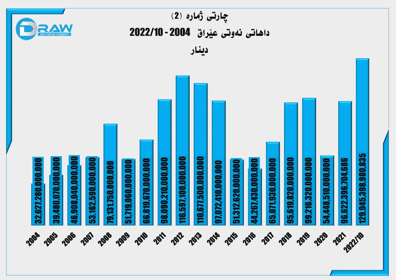 ئەوەی جێگەی ئاماژەیە ساڵی (2004) عێراق کەمترین بڕی داهاتی هەبووەو کۆی داهاتەکەی بریتی بووە لە (32 ترلیۆن و 982 ملیار و 740 ملیۆن) دینار. لە کاتێکدا لە ساڵی (2022) تەنها لە (10) مانگی یەکەمی ساڵەکەدا بەرترین ڕێژەی داهات تۆمار کراوە بەراورد بە (18) ساڵی ڕابردوو کە کۆی داهاتەکەی گەیشتووە بە زیاتر لە (136 ترلیۆن و 262 ملیار دینار)، بە دوو هۆکاری وەک بەرزبوونەوەی نرخی نەوت و دابەزینی بەهای دیناردی عێراقی.