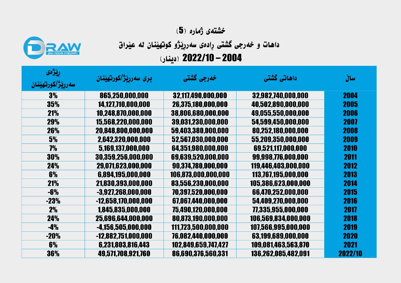 جێگەی ئاماژەی (10) مانگی یەکەمی ساڵی (2022) گەورەترین سەرڕێژەی داهات تێدا ڕوویداو _هێشتاو دوو مانگی ماوە ساڵ تەواو بکات_ نزیکەی (50 ترلیۆن) دینار سەرڕێژی داهات هەبووە. (بۆ وردەکاری بڕوانە چارتی ژمارە (5))