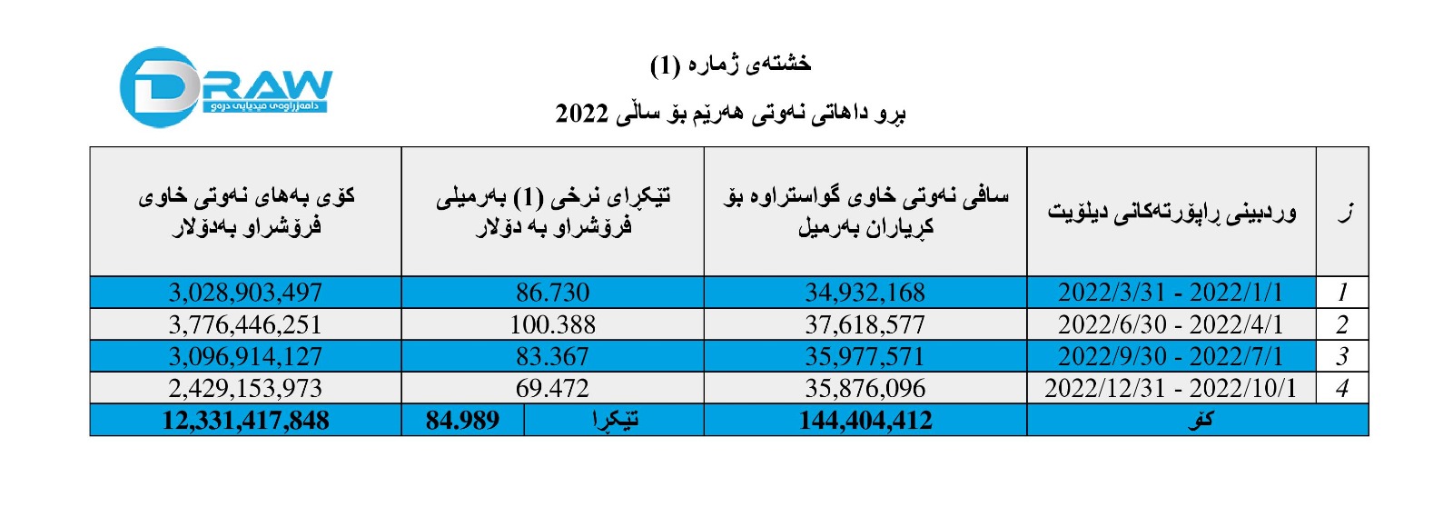 • بەرهەمی نەوت و هەناردە و بەکاربردن و داهات لە ماوەی ١ی کانونی دووەمی 2022 تاکو ٣١ی ئاداری 2022.