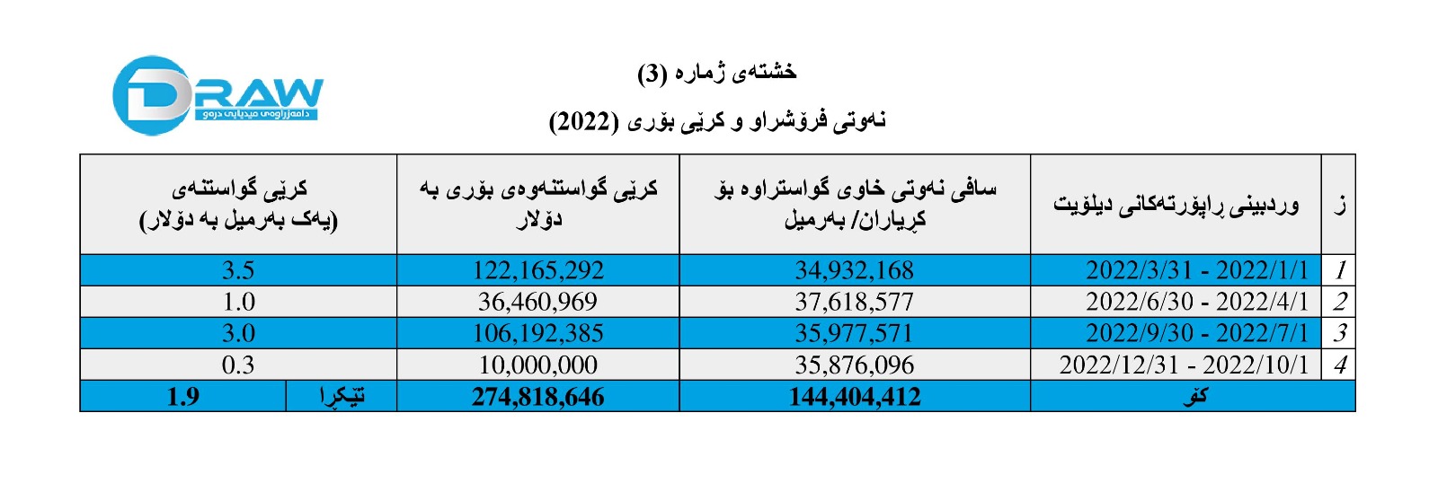 • بەرهەمی نەوت و هەناردە و بەکاربردن و داهات لە ماوەی ١ی تەمموزی 2022 تاکو٣٠ ئەیلوولی 2022.