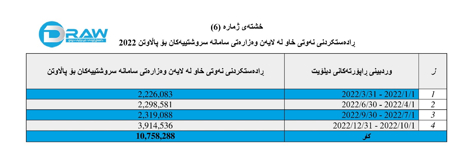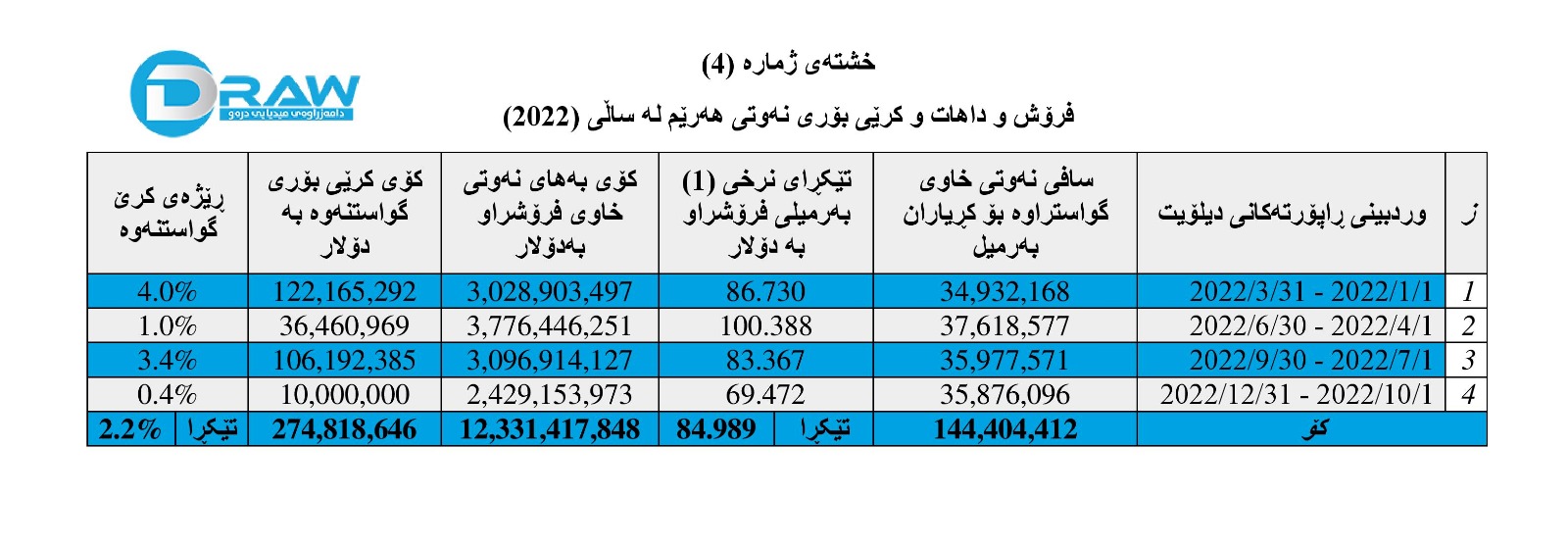 • بەرهەمی نەوت و هەناردە و بەکاربردن و داهات لە ماوەی ١ی نیسانی 2022 تاکو ٣٠ی حوزەیرانی 2022.