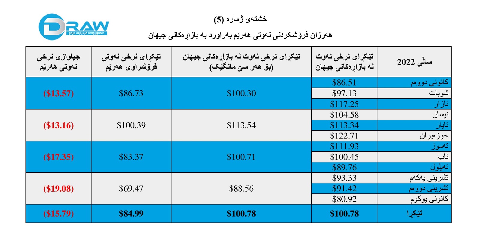 بە گوێرەی ڕاپۆرتەکانی دیلۆیت هەرزان فرۆشتن و هەڕاجکردنی نەوتی هەرێم بەردەوامەو لە ساڵی (2022) نەوتی هەرێم بە تێکڕا (15.79) دۆلار لە خوار نرخی نەوت لە بازاڕەکانی جیهان فرۆشراوە (خشتەی ژمارە (5)) ئەو ڕاستییە زۆرتر ڕووندەکاتەوە.