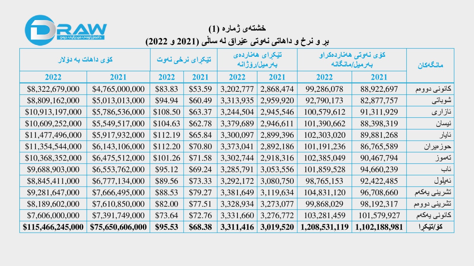 • کۆی داهاتی نەوتی عێراق لە ساڵی (2021) دا بریتی بووە لە (75 ملیار و 650 ملیۆن و 606 هەزار دۆلار). بەڵام لە ساڵی دواتر داهاتی نەوتی فرۆشراو بە ڕێژەی (52.6%) نزیکەی (40 ملیار) دۆلار زیادی کردووەو گەیشتووە بە (115 ملیار و 466 ملیۆن و 245 هەزار) دۆلار.