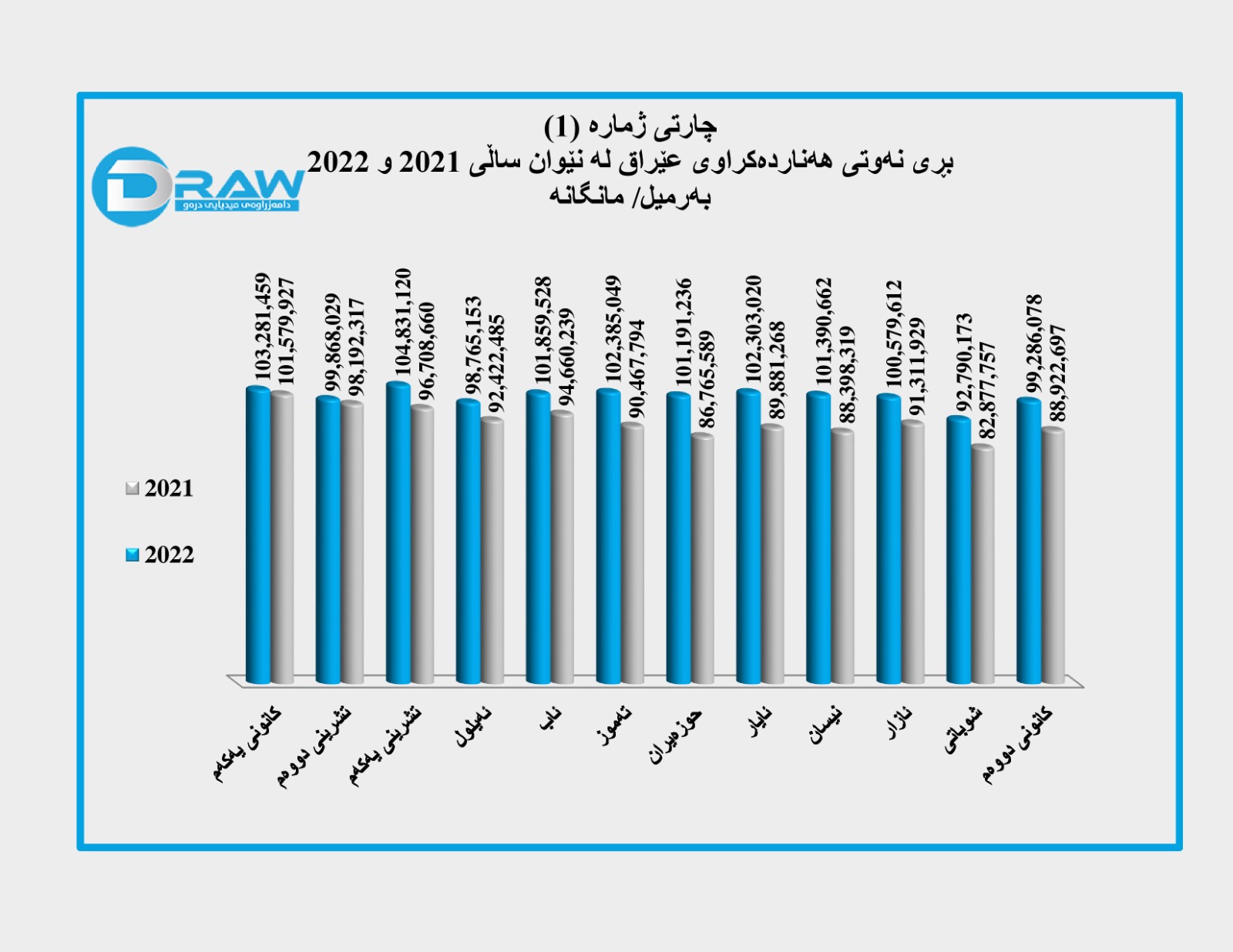 • لە ساڵی (2021)دا بە تێکڕا بەرمیلێک نەوتی عێراق بە (68.4) دۆلار فرۆشراوە. بەڵام لە ساڵی (2022) هەر بەر میلێک (27) دۆلار و بەڕێژەی نزیکەی (40%) زیاتر فرۆشراوە، هەر بەرمیلێک نەوت بە تێکڕا دراوە بە (95.53) دۆلار.