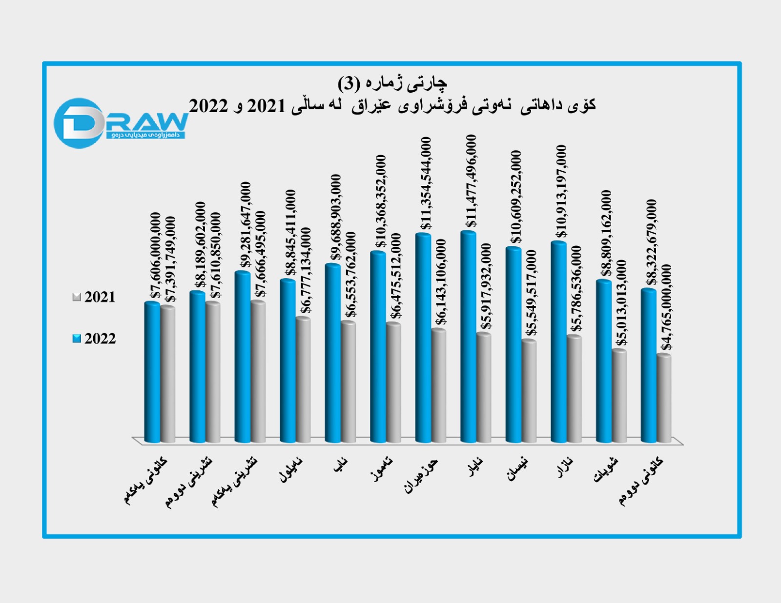 • عێراق لە ساڵی (2021)دا بڕی (1 ملیار و 102 ملیۆن و 188 هەزار و 981) بەرمیلی نەوتی بە تێکڕای رۆژانەی (3 ملیۆن و 19 هەزار و 520) بەرمیل نەوتی فرۆشتووە، بەڵام لە ساڵی (2022) قەبارەی فرۆشتن بۆ نزیکەی (10%) زیادی کردووە بۆ (1 ملیار و 208 ملیۆن و 531 هەزار و 119) بەرمیل و بە تێکڕای رۆژانەی (3 ملیۆن و 311 هەزار و 416) بەرمیل نەوت.