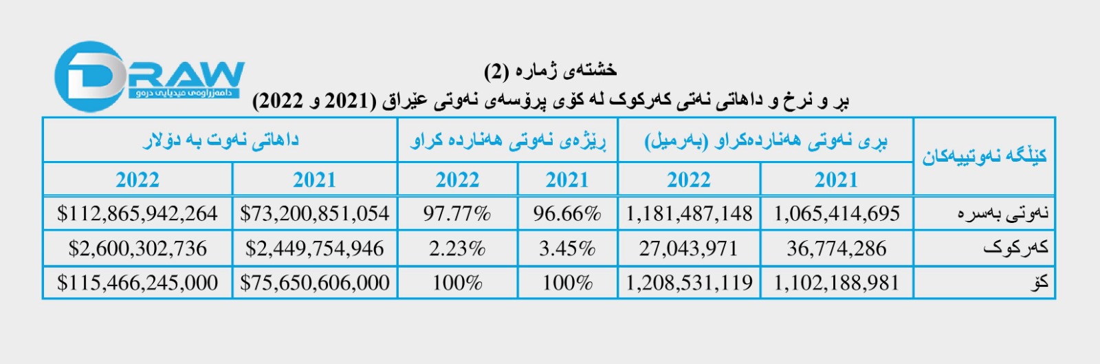 بەڵام بەهاکەی بە ڕێژەی (6%) زیادی کردووەو لە (2 ملیار و 449 ملیۆن و 754 هەزار و 946) دۆلارەوە لە ساڵی (2021) بەرزبووەتەوە بۆ (2 ملیار و 600 ملیۆن و 302 هەزار و 736) دۆلار لە ساڵی (2022)دا، واتە سەرباری ئەوەی ڕێژەی هەناردەکردن لە کێڵگەکانی نەوتی کەرکوک دابەزیوە بە بەهای نەوتەکەی لە ساڵی ڕابردوودا زیاتر لە (150 ملیۆن دۆلار) زیادی کردووە. (بڕوانە خشتەی ژمارە (2))