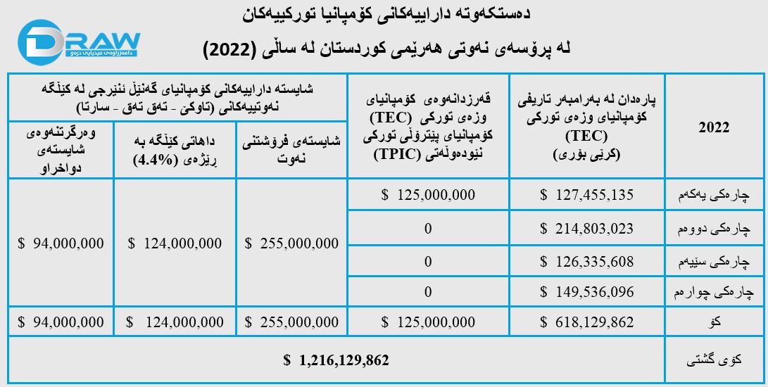 لە ساڵی (2022)دا کۆمپانیا تورکییەکان بڕی (ملیارێک و 216 ملیۆن و 129 هەزار و 862) دۆلاریان لە پرۆسەی نەوتی هەرێم وەرگرتووە، بە جۆرێک؛