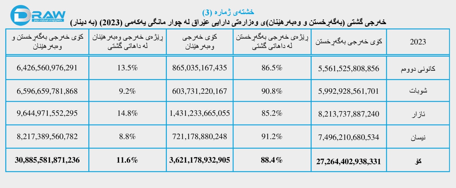 لە چوار مانگی یەکەمی ساڵی (2023)، کۆی گشتی خەرجییەکانی عێراق بە هەردوو خەرجی (بەگەڕخستن و وەبەرهێنان)ەوە، بریتی بووە لە (30 ترلیۆن و 885 ملیار و 581 ملیۆن و 871 هەزار و 237) دینار.