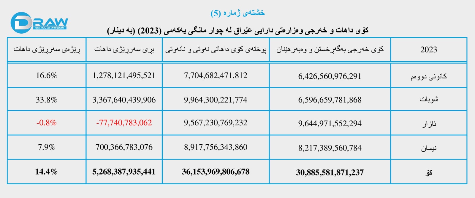 واتە بڕی (5 ترلیۆن و 268 ملیار و 387 ملیۆن و 935 هەزار و 441) دیناری بەڕێژەی (14.4%) لە داهاتی گشتی ماوەتەوە. سەبارەت بە وردەکاری مانگەکانی کانونی دووەم، شوبات، ئازار و نیسانی ساڵی (2023) بڕوانە (خشتەی ژمارە (5)).