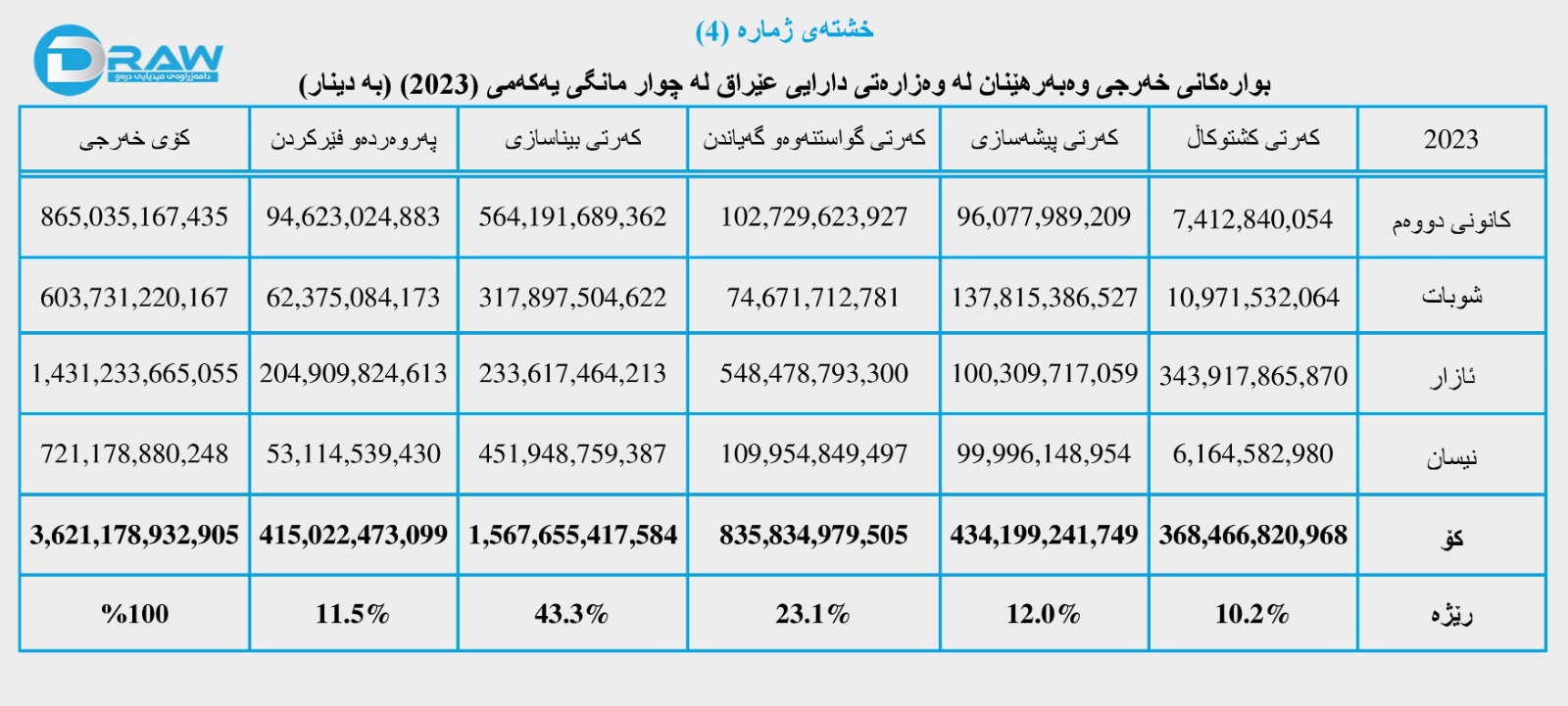 بۆ وردەکاری خەرجییەکانی وەبەرهێنان لە کەرتە جیاوازەکان لە چوار مانگی یەکەمی ساڵی (2023) بڕوانە (خشتەی ژمارە (4)).