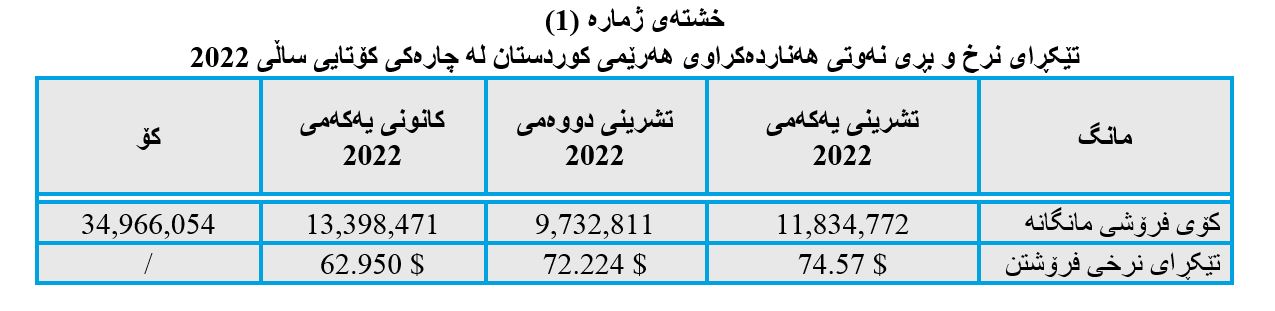 لە خشتەکانی خوارەوەدا تێبینی بڕی نەوتی هەناردەکراو و نرخی بەرمیلێک نەوت دەکەین، کە هەرێمی کوردستان و حکومەتی ناوەند لە چارەکی کۆتایی ساڵی ٢٠٢٢ هەناردەیان کردووە.