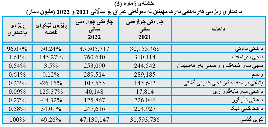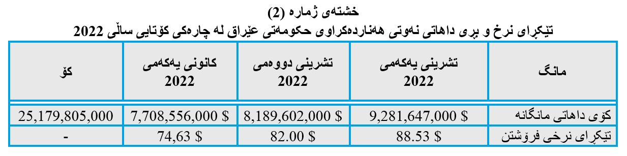 هەربۆیە هەژمارنەکردنی داهاتی نەوتی هەرێم لە چوارچێوەی داهاتە گشتییەکاندا، زیانی بە بودجەی گشتی عێراق گەیاندووە، بە نزیکەی قەبارەی (30 بۆ 35 ملیۆن) دۆلار لە ڕۆژێکدا، بەمانایەکی دیکە نزیکەی یەک ملیار دۆلار لە مانگێکدا دەگەڕێتەوە بۆ سەر داهاتی حکومەتی ناوەندی، ئەمەش کاریگەی گەورەی لەسەر کەمکردنەوەی کورتهێنان دەبێت لە بودجەی گشتی وڵاتدا. وەک لە خشتەی (3)دا بڕی داهاتی نەوت و نرخی بەرمیلێک نەوت لە دواهەمین چارەکی ساڵانی 2021 و 2022ی عێراق نیشان دراوە، بەدەر لە داهاتەکانی هەرێمی کوردستان.