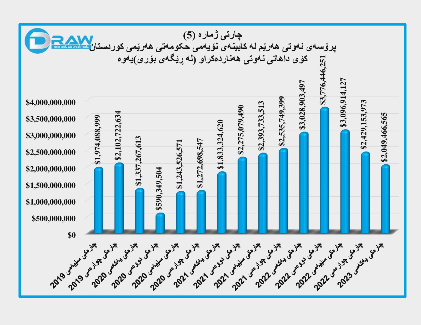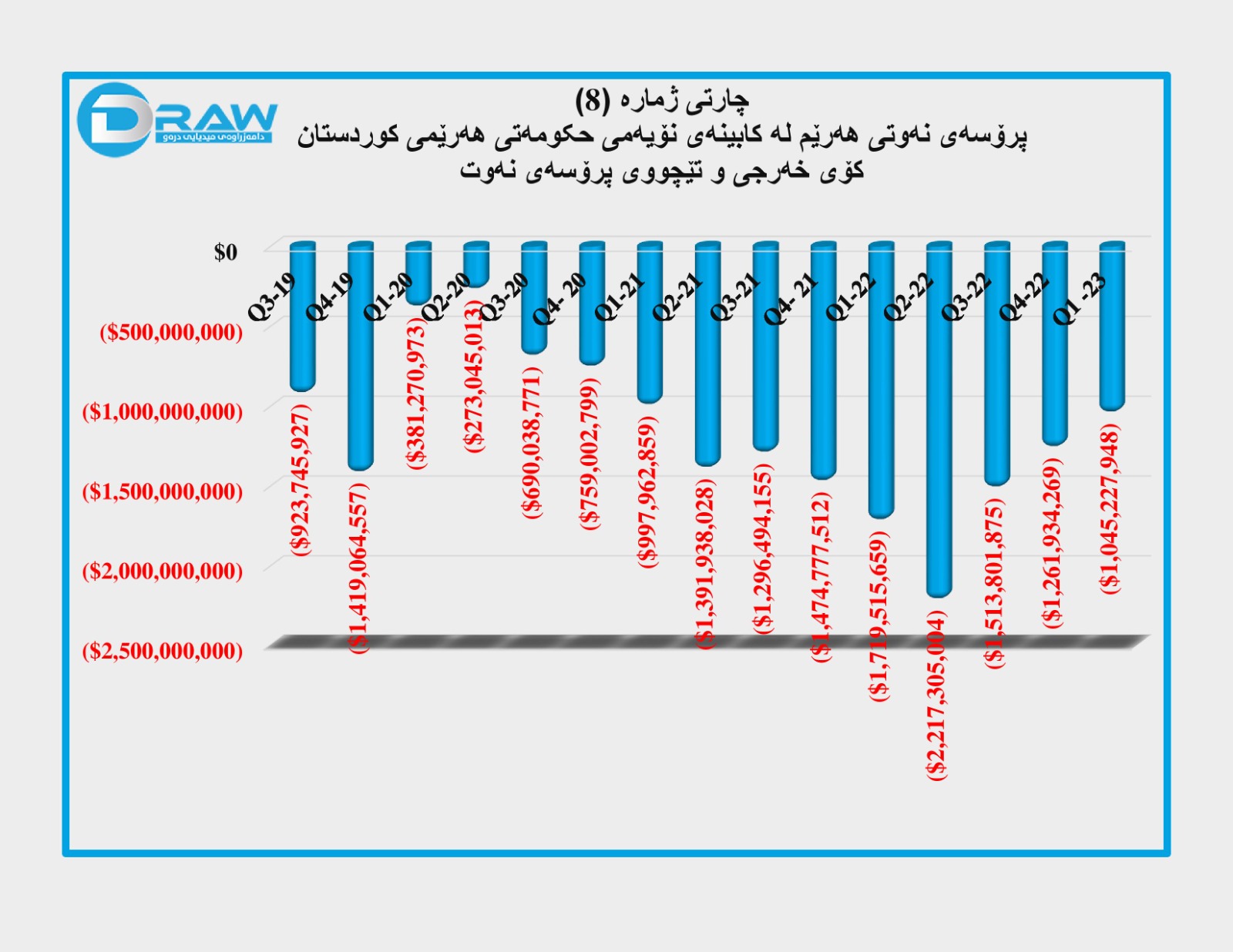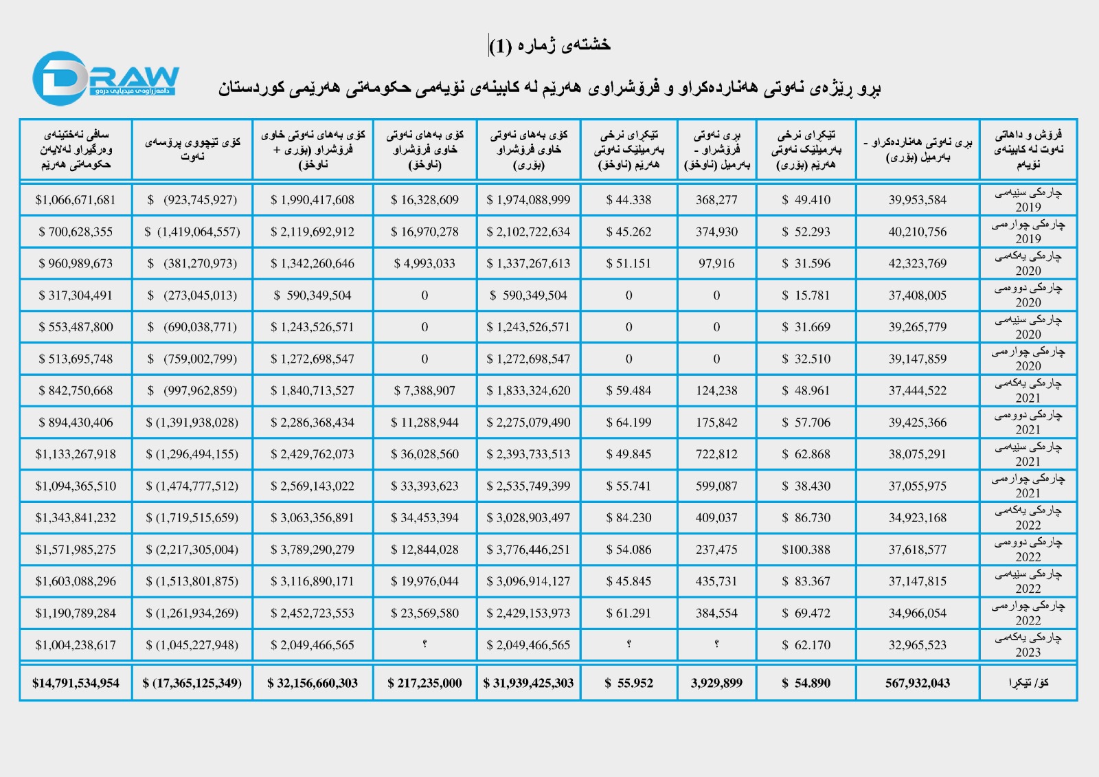 کۆمپانیای دیلۆیت بۆ چارەکی یەکەمی (2023) هیچ داتاو ڕاپۆرتێکی بڵاو نەکردووەتەوە، بۆیە بۆ داتاکانی ئەو ماوەیە لە بارەی بڕی هەناردەو داهات و خەرجی نەوت پشت بە زانیارییە رۆژنامەوانییەکان بەستراوە.
