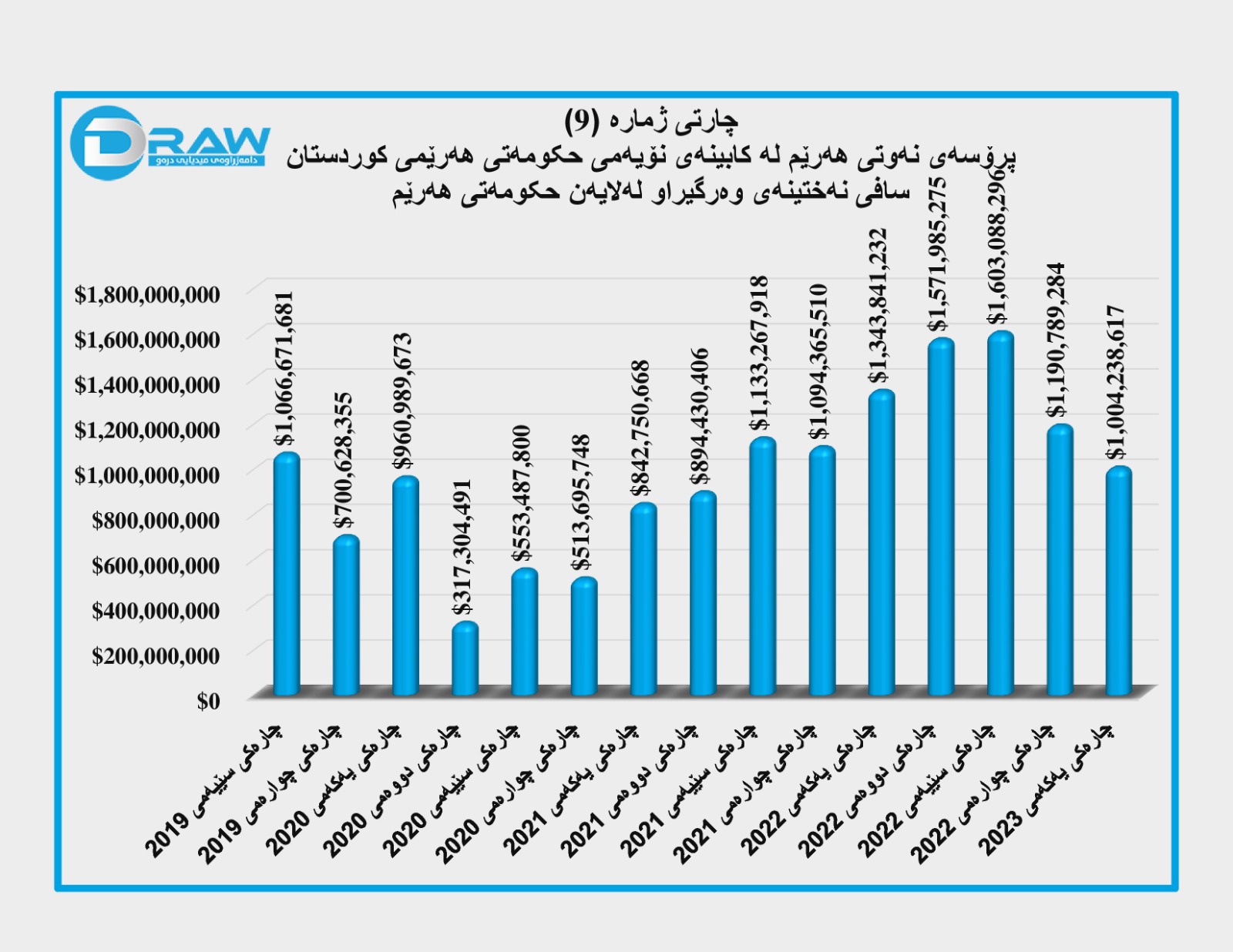 بە درێژایی تەمەنی کابینەی نۆیەمی حکومەتی هەرێم، (31 ملیار و 939 ملیۆن و 425 هەزار و 303) دۆلار داهاتی نەوتی هەناردە کراوی هەرێم بووە. زۆرترین داهاتیش لە چارەکی دووەمی ساڵی (2022)دا بووەو تێدا بڕی (3 ملیار و 776 ملیۆن و 446 هەزار و 251) دۆلار داهاتی نەوت بووە. کەمترین داهاتیش لە چارەکی دووەمی ساڵی (2020) بووە بە تۆمارکردنی بڕی (590 ملیۆن و 349 هەزار و 504) دۆلار. بۆ وردەکاری بڕوانە (خشتەی ژمارە (1) و چارتی ژمارە (5)).