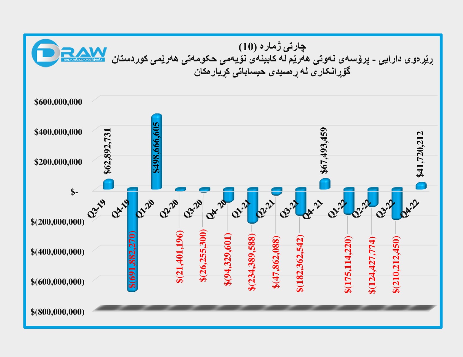 بەپێی ڕاپۆرتەکانی دیلۆیت لە ماوەی کابینەی نۆیەمی حکومەتی هەرێمی کوردستان لە کاتی گۆڕانکاری لە ڕەسیدی حیساباتی کڕیاران چوار جار (لە چارەکی سێیەمی (2019)، چارەکی یەکەمی (2020)، چارەکی چوارەمی (2021) و چارەکی چوارەمی (2022)) بە گوژەمەی جیاواز پارە گەڕاوەتەوە بۆ حکومەتی هەرێم و لە سەرجەم ماوەکانی دیکە پارەکان خراوەتە سەر ڕەسیدی کڕیاران و بە تێکرای گشتیش (ملیارێک و 137 ملیۆن و 464 هەزار و 22) دۆلار چووەتە سەر حیساباتی کڕیاران. بۆ وردەکاری بڕوانە (خشتەی ژمارە (2) و چارتی ژمارە (10)).