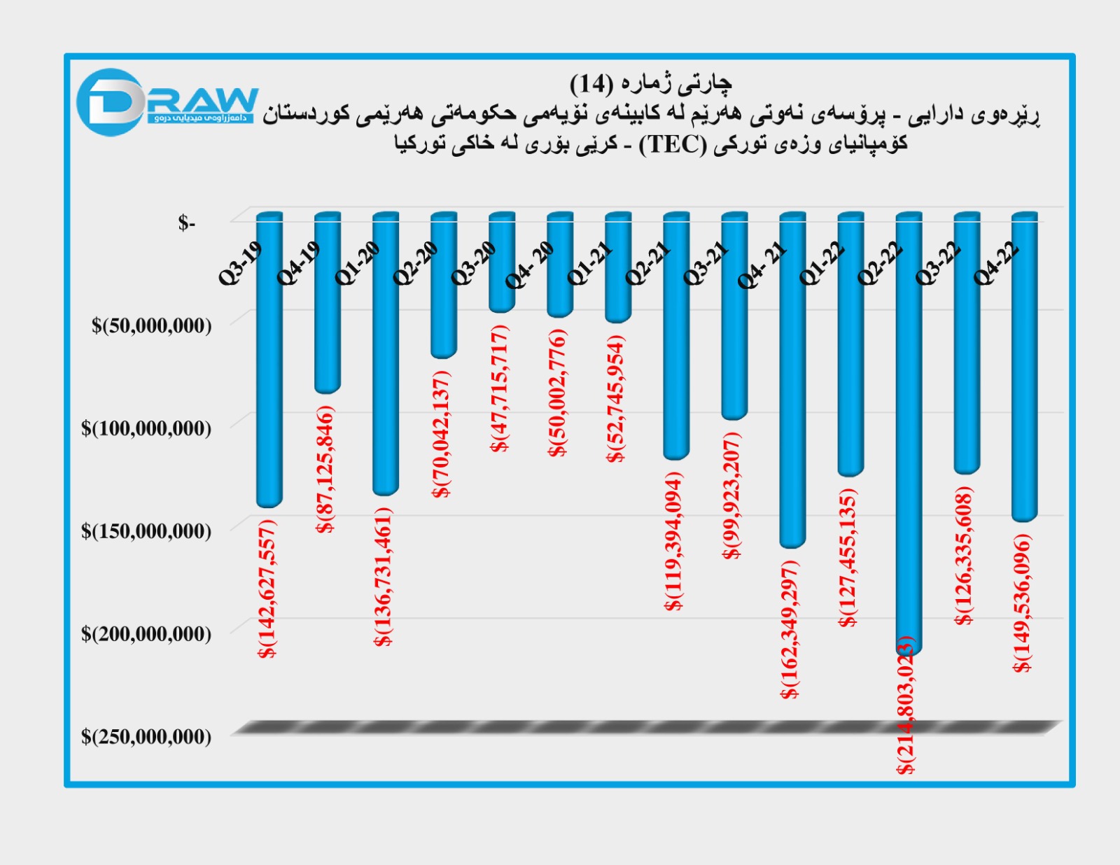 پاڵپشت بە داتاکان، حکومەتی هەرێمی کوردستان بۆ گواستنەوەی نەوتەکەی لە نێو خاکی تورکیادا لە سەردەمی کابینەی نۆیەمدا، بەکۆی گشتی بڕی (ملیارێک و 586 ملیۆن و 787 هەزار و 908) دۆلار بۆ کۆمپانیای وزەی تورکی (TEC) چووە. گەورەترین پارەدانیش بۆ ئەم مەبەستە لە چارەکی دووەمی (2022) دا بریتی بووە لە بڕی (214 ملیۆن و 803 هەزار و 23) دۆلار، کەمترین خەرجی گواستنەوە بۆ کۆمپانیا تورکییەکە لە چارەکی سێیەمی (2020) تۆمار کراوە بە بڕی (47 ملیۆن و 715 هەزار و 717) دۆلار. بۆ وردەکاری بڕوانە (خشتەی ژمارە (2) و چارتی ژمارە (14)).