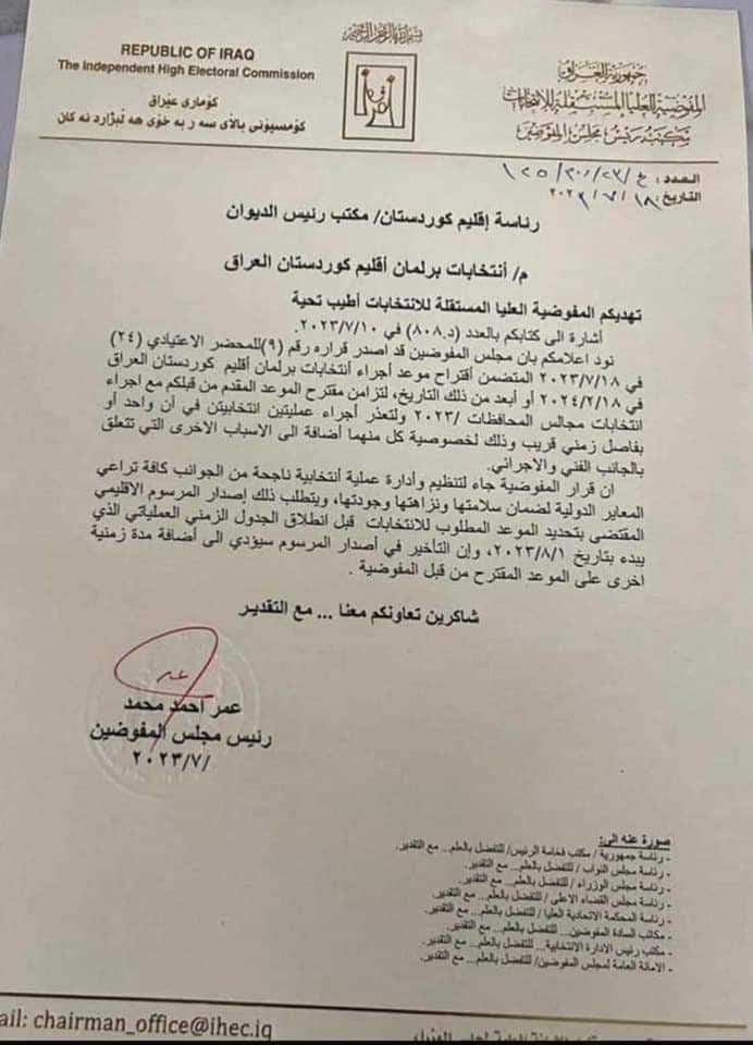 رۆژی 10ی ئەم مانگە، سەرۆكایەتیی هەرێمی كوردستان نوسراوێكی ئاڕاستەی كۆمسیۆنی هەڵبژاردنەكانی عێراق كرد، تێیدا داوایكرد: