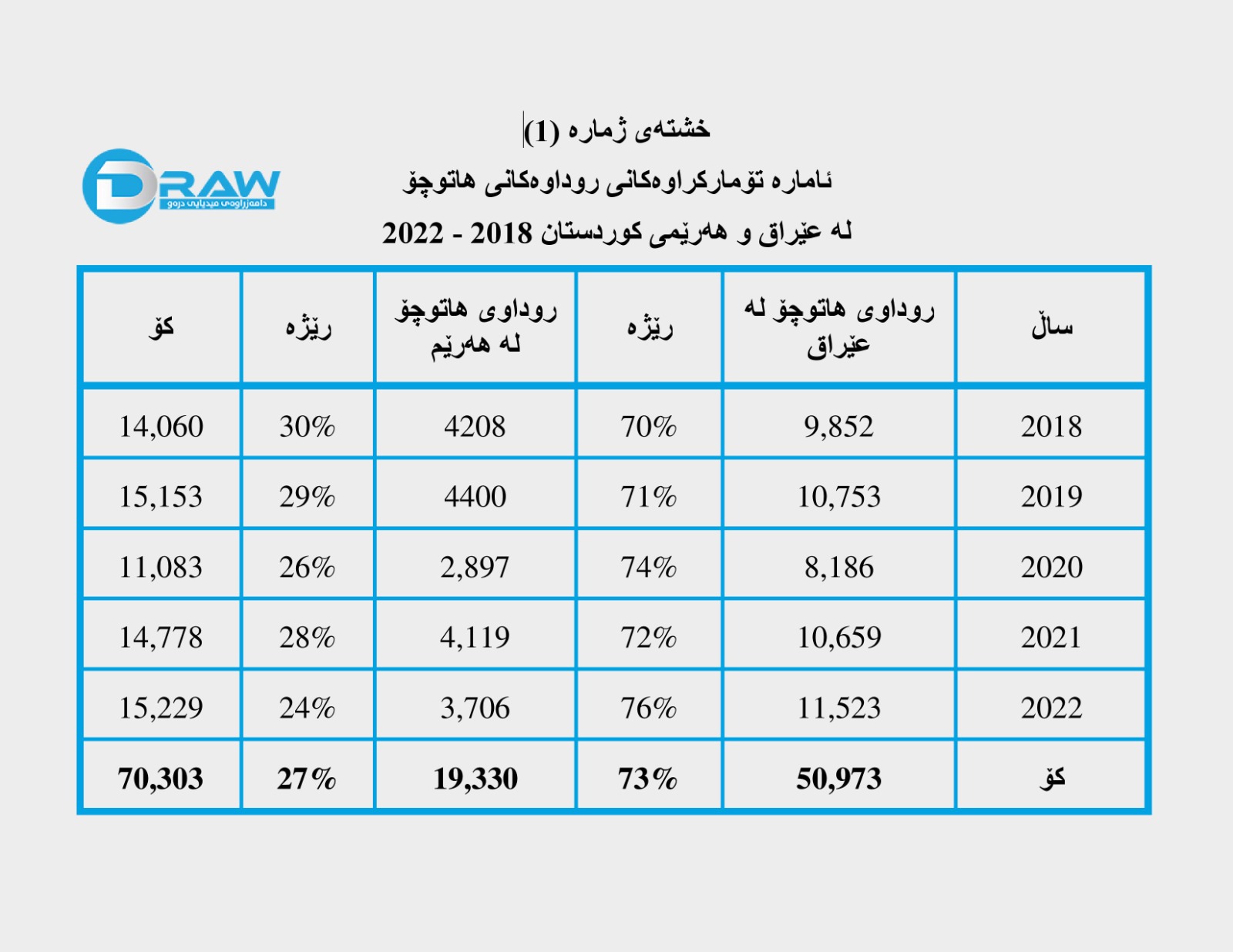 ? (70 هەزار و 303) روداوی هاتوچۆ تۆمارکراون، کە (73%)ی لە پارێزگاکانی عێراق و (27%)یان لە سێ پارێزگاکەی هەرێم رویانداوە.