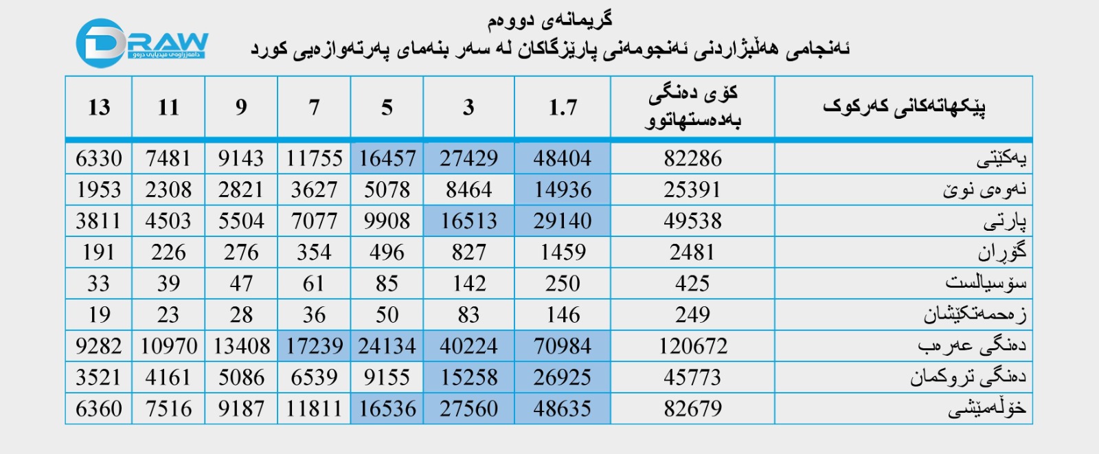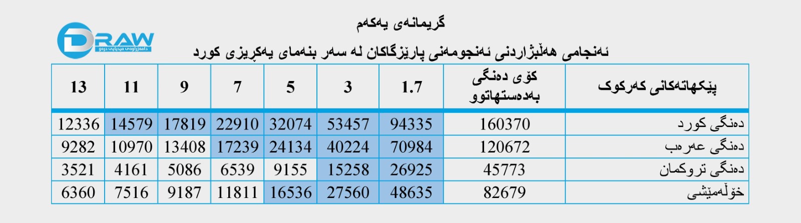 پشت بەست بە دواین هەڵبژارنی ئەنجومەنی نوێنەرانی عێراق لە پارێزگای کەرکوک؛ کورد بە یەکڕیزی لە کەرکوک براوەی یەکەم دەبێت بە مسۆگەر کردنی (6) کورسی، پێکهاتەی عەرەب (4) کورسی و تروکمانیش (2) کورسی بەدەستدەهێنێت و (3) کورسیش بە خۆڵەمێشی دەمێنێتەوە و بێگومان کورد پشکی تێیدا دەبێت.