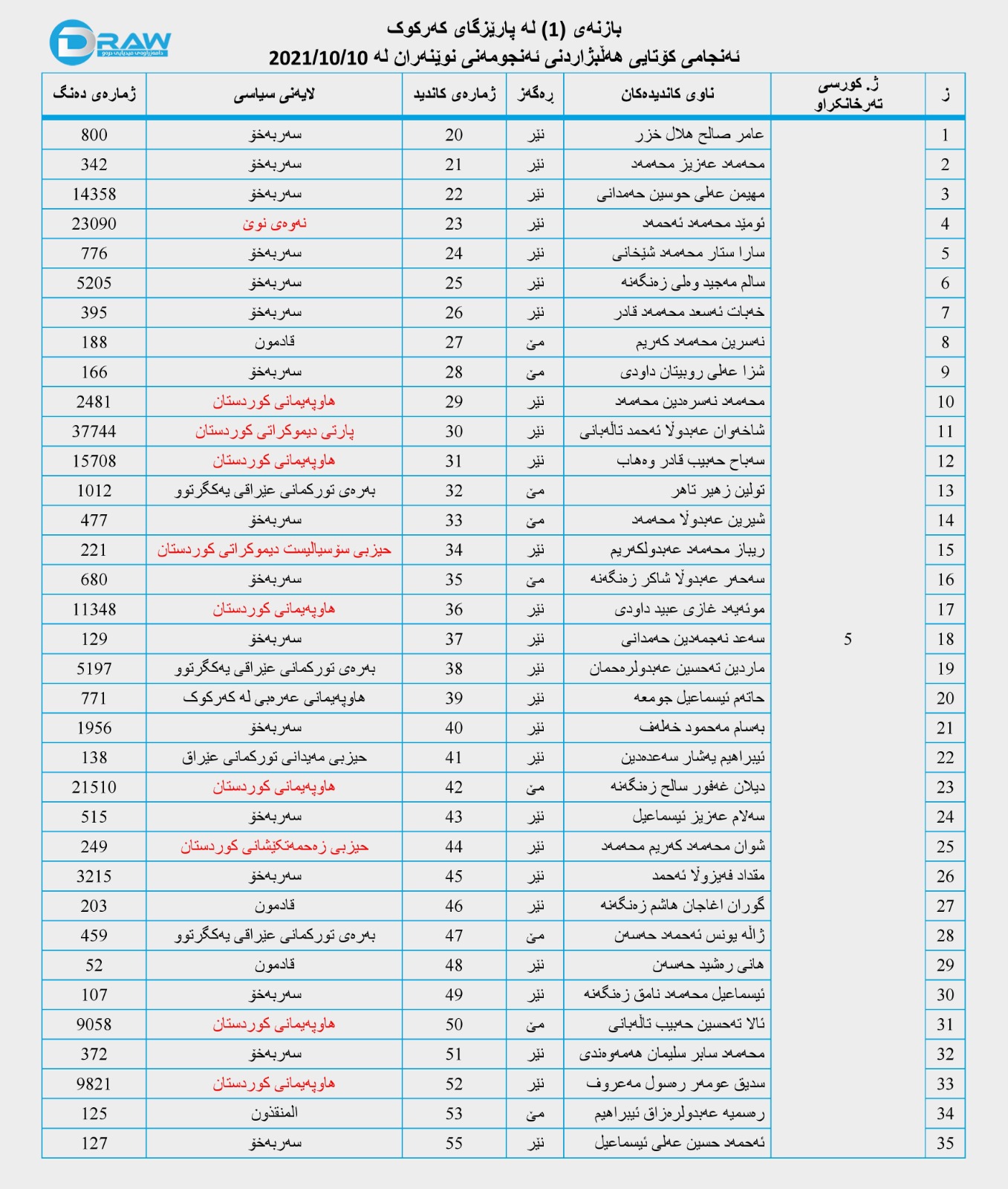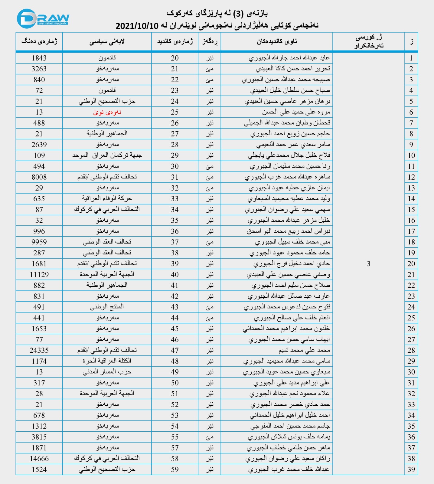 - کۆمسیۆنی سەربەخۆی هەڵبژاردنەکانی عێراق، ئەنجامی کۆتایی هەڵبژاردنی ئەنجومەنی نوێنەرانی عێراق لە 10/10/2021.