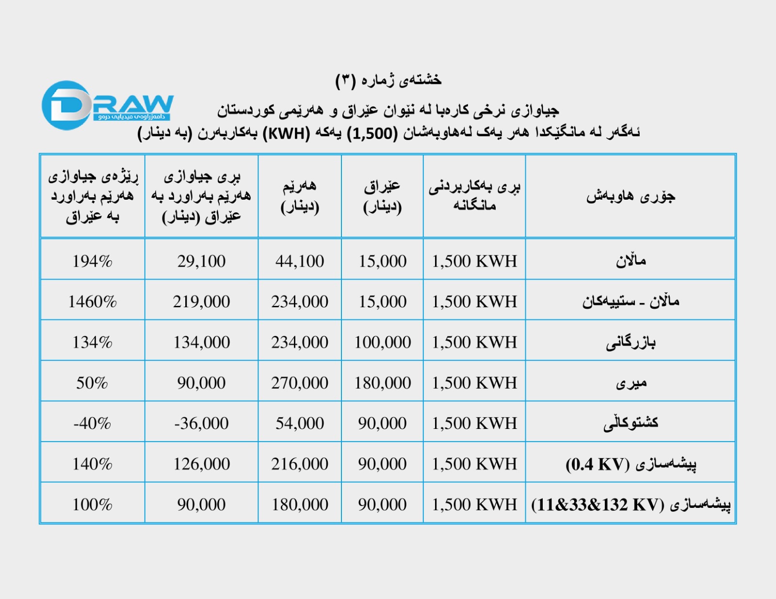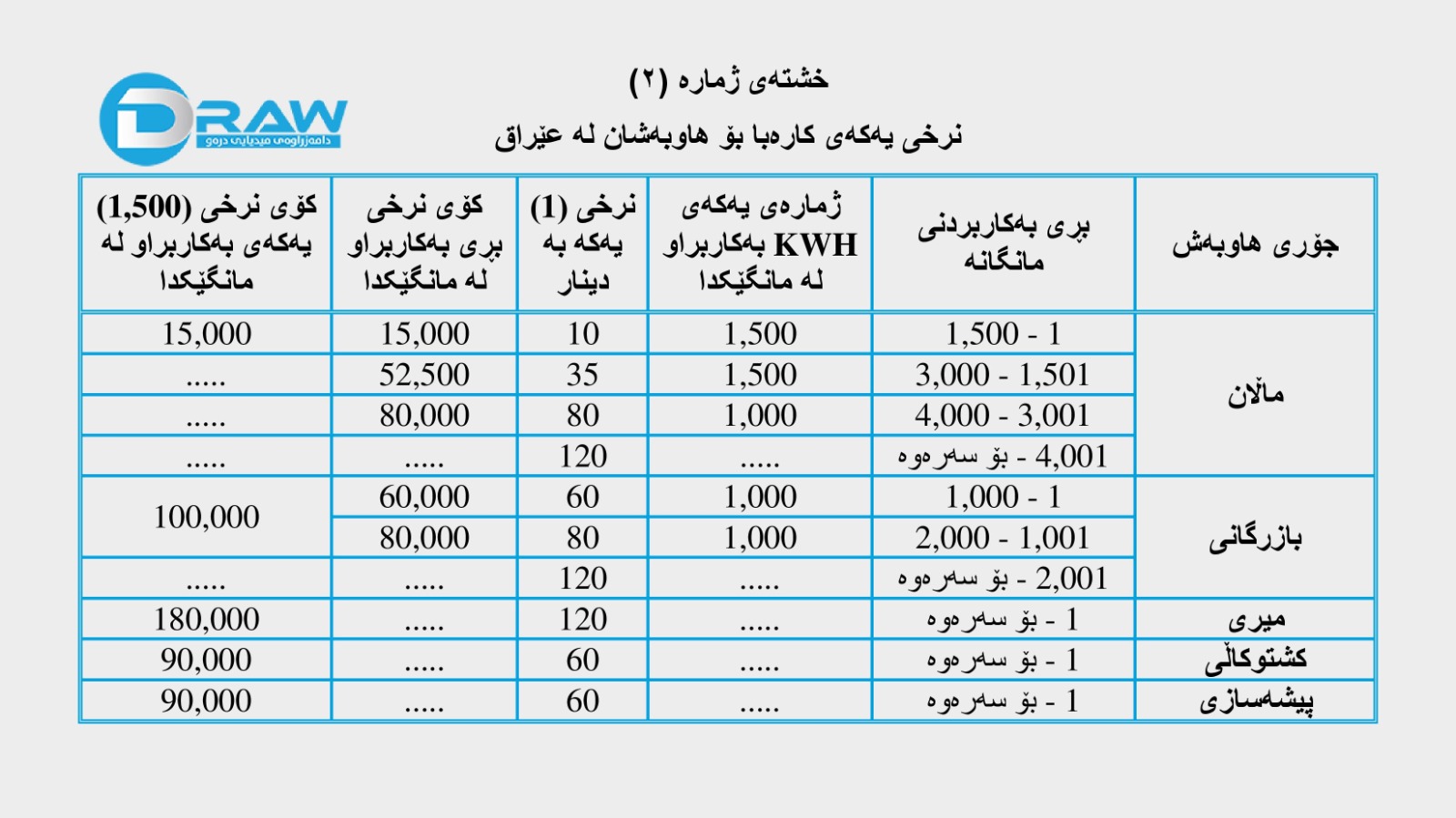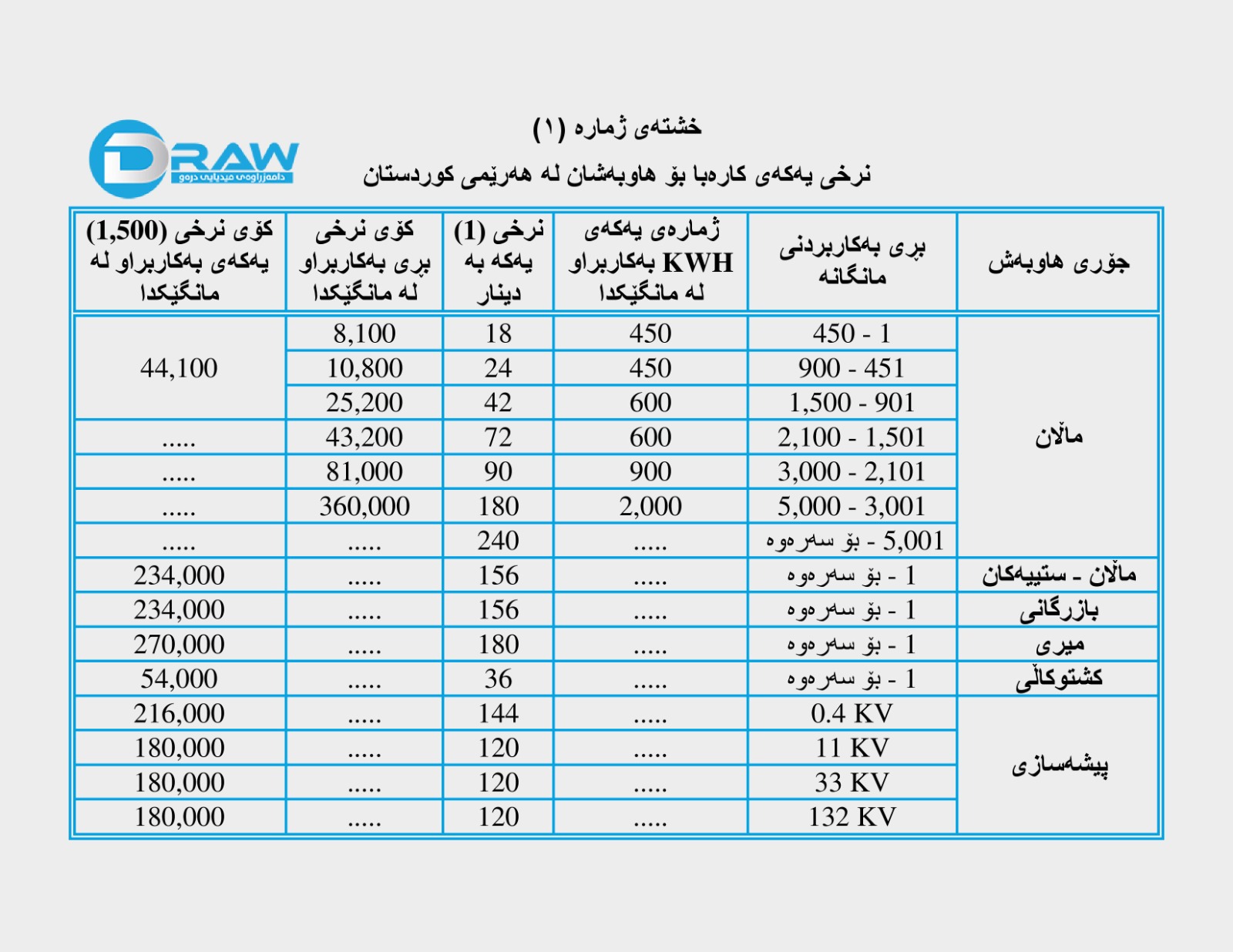 بەپێی ڕێنماییەکانیش نرخی کارەبا بۆ هاوبەشانی کارەبا لە هەرێمی کوردستان بەم جۆرەی خوارەوە دەبێت؛