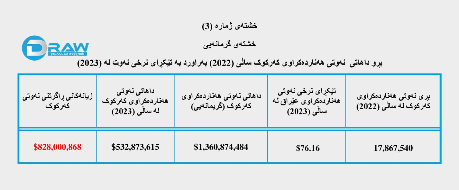 بۆیە ئەگەر گریمانەی ئەوە بکەین، بەهەمان قەبارەی ساڵی ڕابردوو نەوتی کەرکوک لە رێگەی بۆری نەوتی کوردستانەوە هەناردە بکرایە بە نرخی (76.16) دۆلار بۆ هەر بەرمیلێک، وەک ئەوەی تا کۆتایی مانگی ئابی (2023)دا تۆمار کراوە، ئەوا کۆی بەهای نەوتی کەرکوک بریتی دەبوو لە (ملیارێک و 360 ملیۆن و 874 هەزار و 484) دۆلاری ئەمریکی.