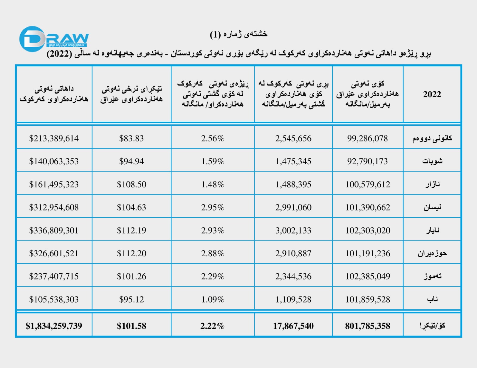 بەپێی داتاکانی وەزارەتی نەوتی عێراق لە سەرەتای ساڵی (2022)ەوە تا کۆتایی مانگی ئابی هەمان ساڵ بڕی (801 ملیۆن و 785 هەزار و 358) بەرمیل نەوتی هەناردەی وڵاتانی دەرەوە کردووە، لەو بڕەش (17 ملیۆن و 867 هەزار و 540) بەرمیلی بەڕێژەی (2.22%)ی نەوتی کێڵگەکانی پارێزگای کەرکوک بووە، کە بە تێکڕا لە ماوەی ناوبراودا بەرمیلێک نەوت بە (101.58) دۆلاری ئەمریکی فرۆشراوە، بۆیە کۆی بەهای نەوتی کەرکوک لە کانونی دووەمەوە تا کۆتایی ئابی 2022 بریتی بووە لە (ملیارێک و 834 ملیۆن و 259 هەزار و 739) دۆلار. بۆ وردەکاری تەواوی مانگەکان بڕوانە (خشتەی ژمارە (1)).