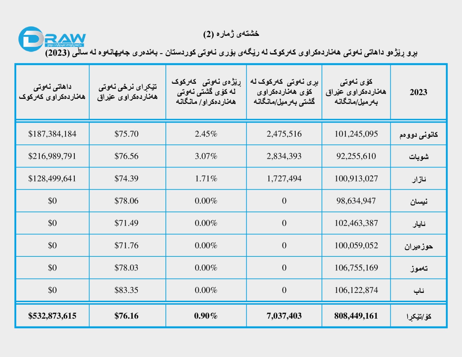 ? تا کۆتایی مانگی ئابی (2023) تەنها بە بەهای (532 ملیۆن و 873 هەزار 615) دۆلار نەوتی کەرکوک لە ڕێگەی بۆری نەوەتی کوردستانەوە فرۆشراوە.