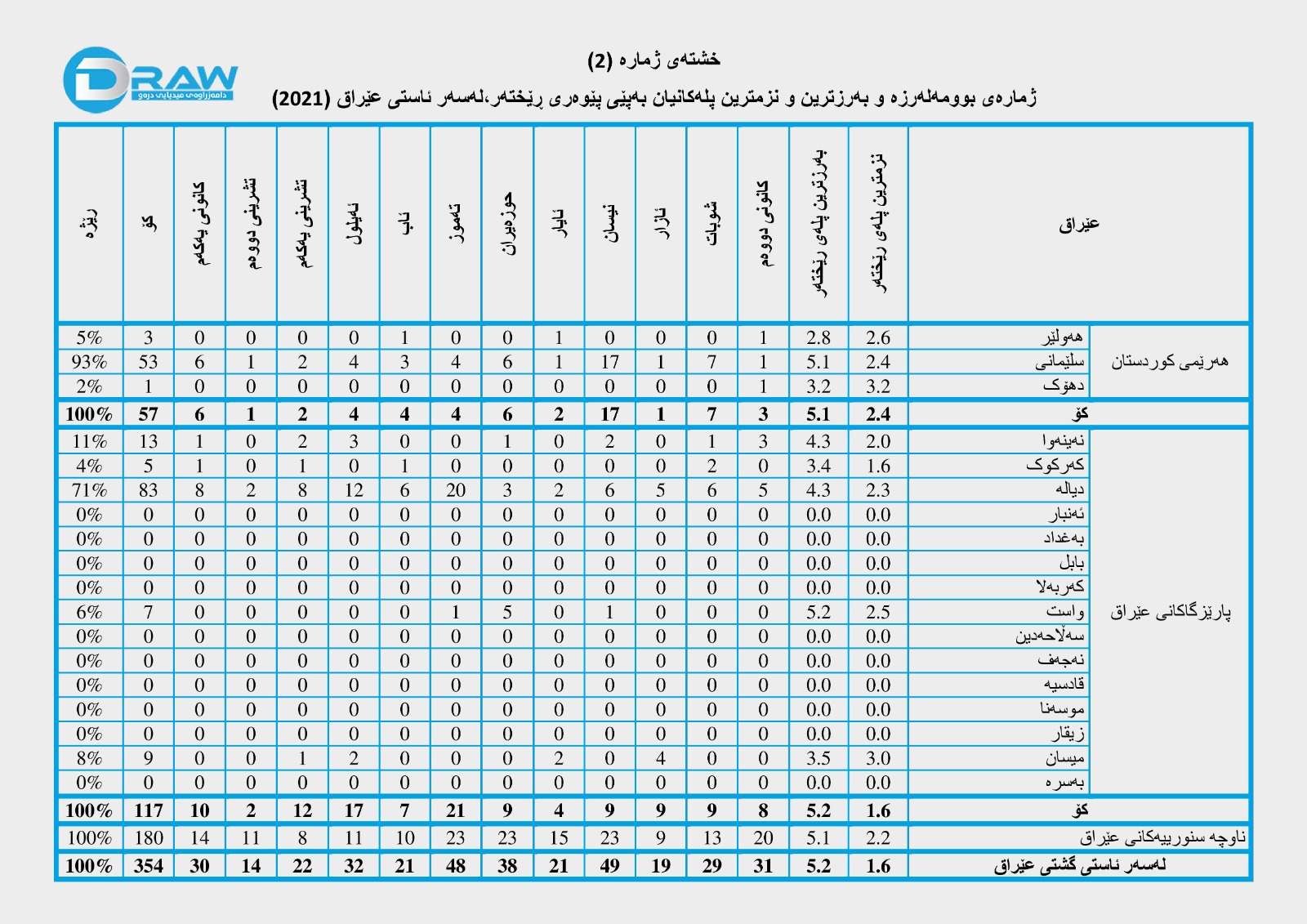 دووەم؛ ژمارەی بوومەلەرزە و بەرزترین و نزمترین پلەکانیان بەپێی پێوەری ڕێختەر، لەسەر ئاستی عێراق و هەرێم لەساڵی (2021)