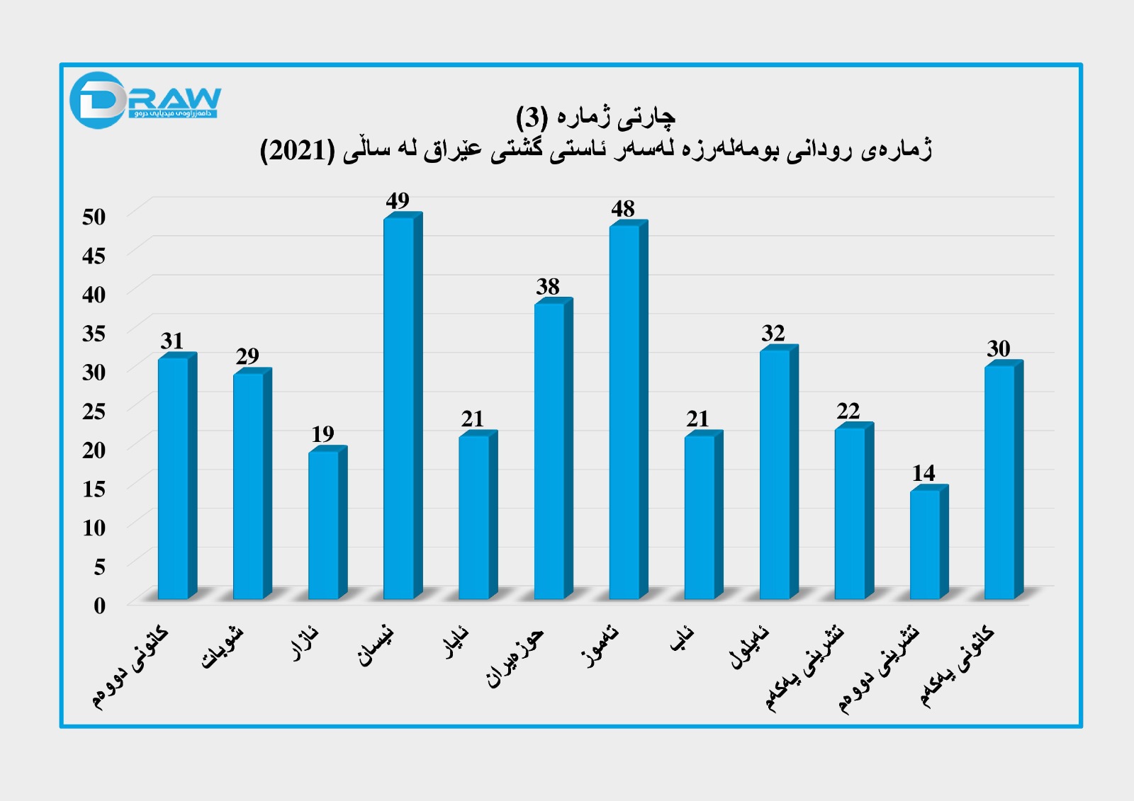 زۆرترین حاڵەتەکانیش لە مانگی نیسانی (2021) تۆمارکراوەو کەمترین حاڵەتیش لە مانگی تشرینی دووەم بووەو گەیشتووە (14) حاڵەتی تۆمارکراو.