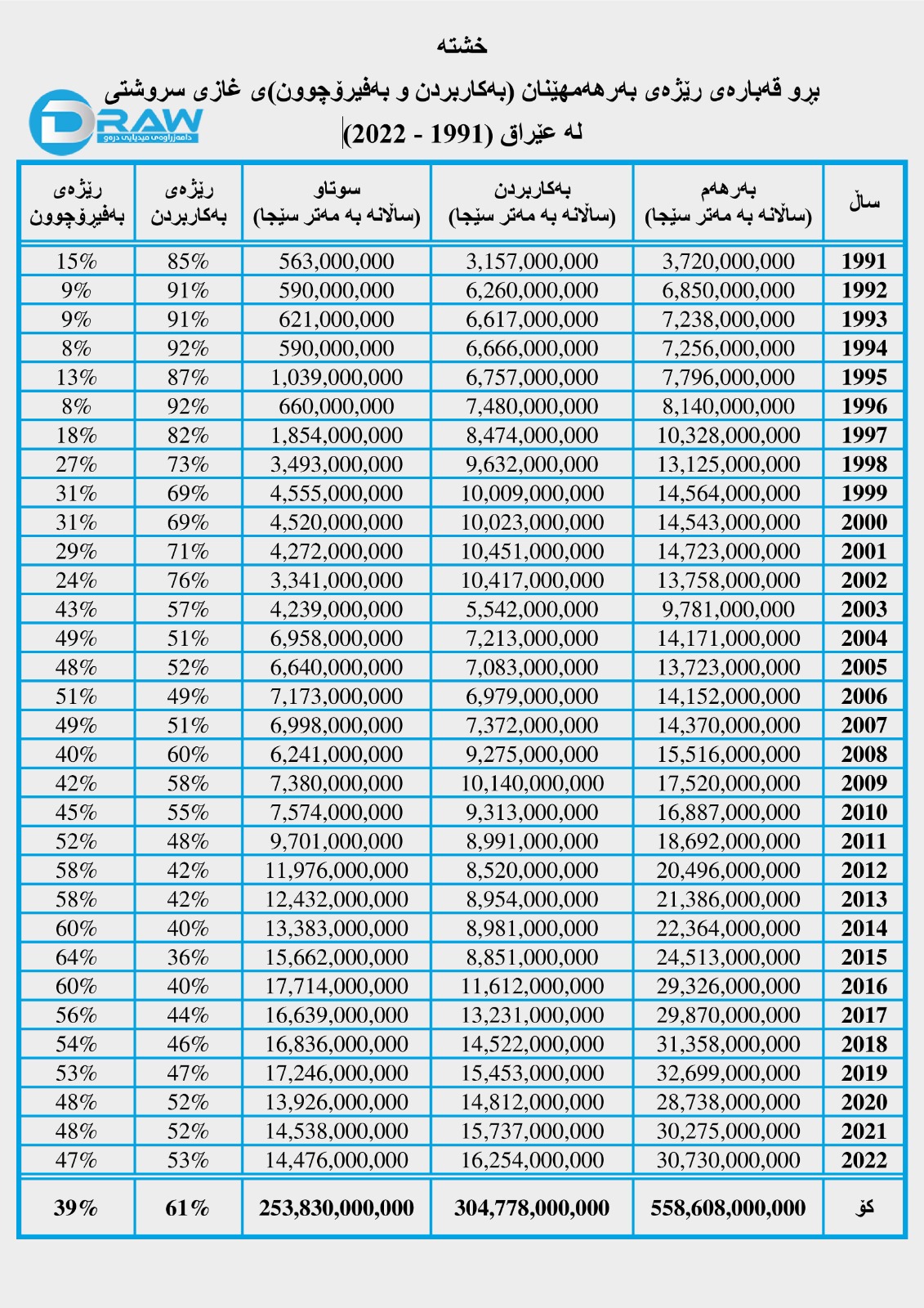 ? بڕی (304 ملیار 778 ملیۆن) مەتر سێجای بە ڕێژەی (61%) بەکاربراوە.