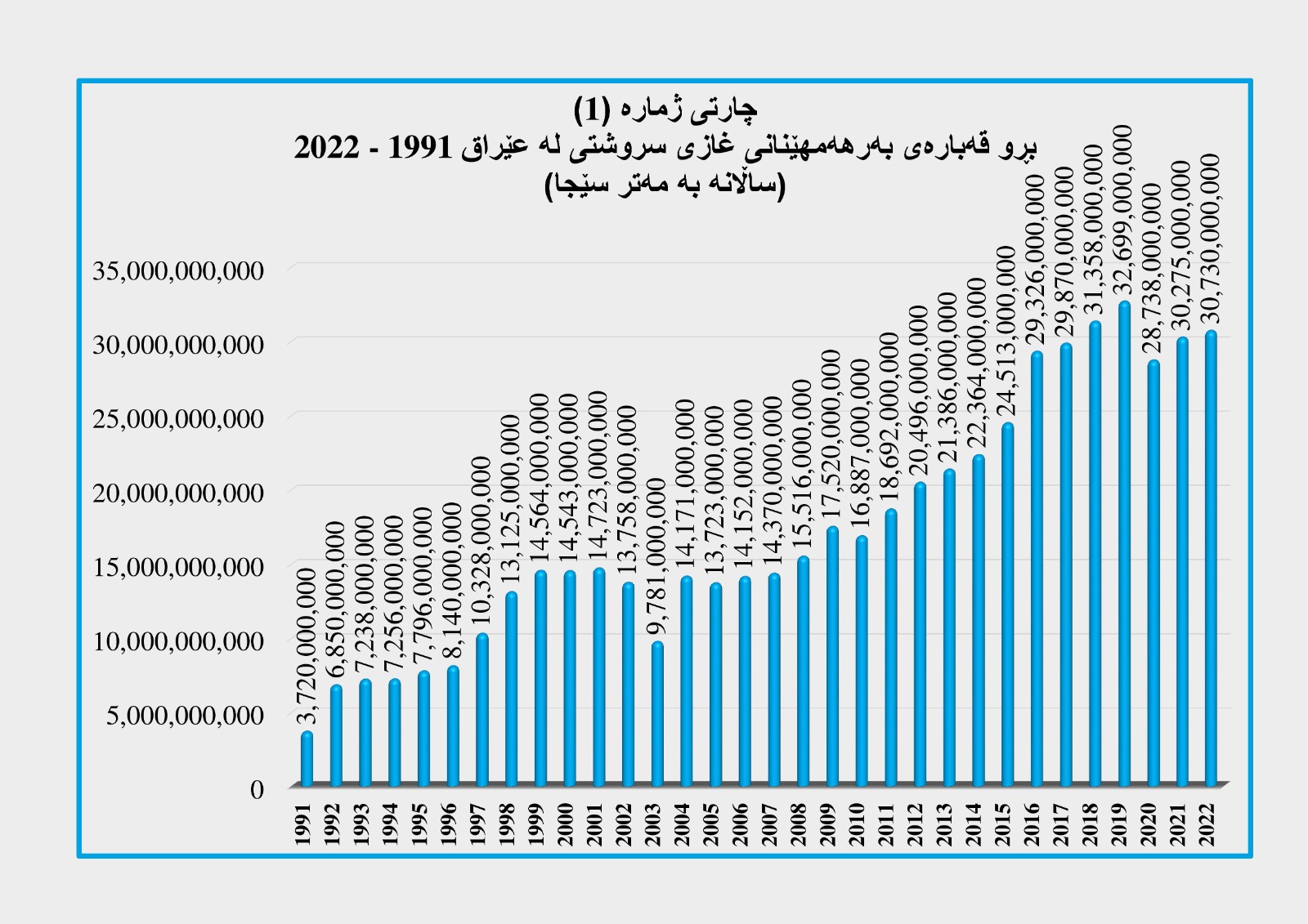 یەکەم؛ بڕو قەبارەی بەرهەمهێنانی غازی سروشتی لە عێراق 1991 - 2022