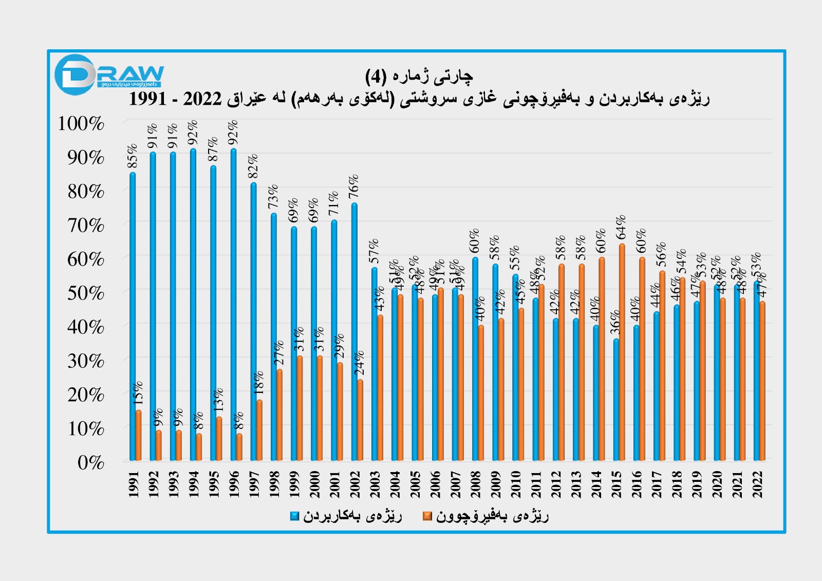چوارەم؛ رێژەی بەکاربردن و بەفیڕۆچوونی غازی سروشتی (لە کۆی بەرهەم) لە عێراق 1991 - 2022