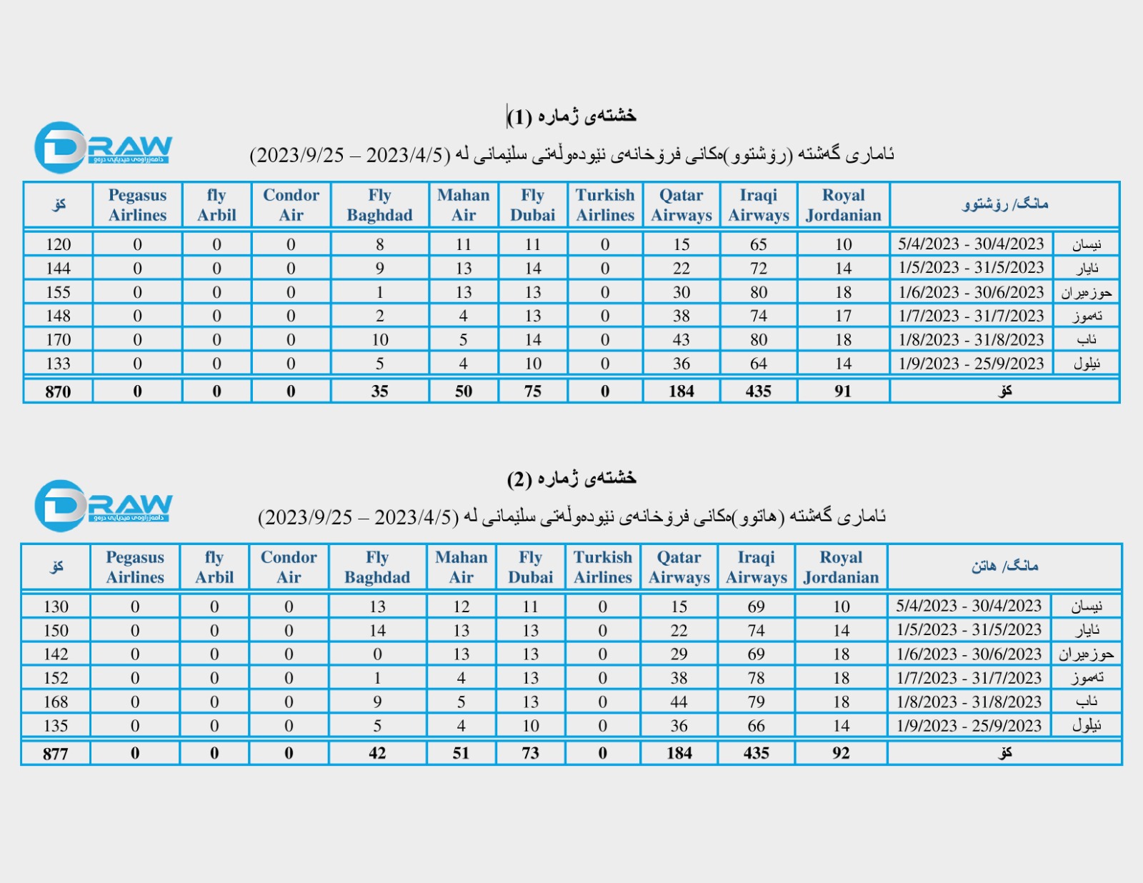 بۆ وردەکاری گەشتەکانی (هاتن و رۆشتن) لە فرۆکەخانەی نێودەوڵەتی سلێمانی بەپێی کۆمپانیا و مانگەکان لە (5/4/2023 – 25/9/2023) بڕوانە خشتەکانی (1 و 2).