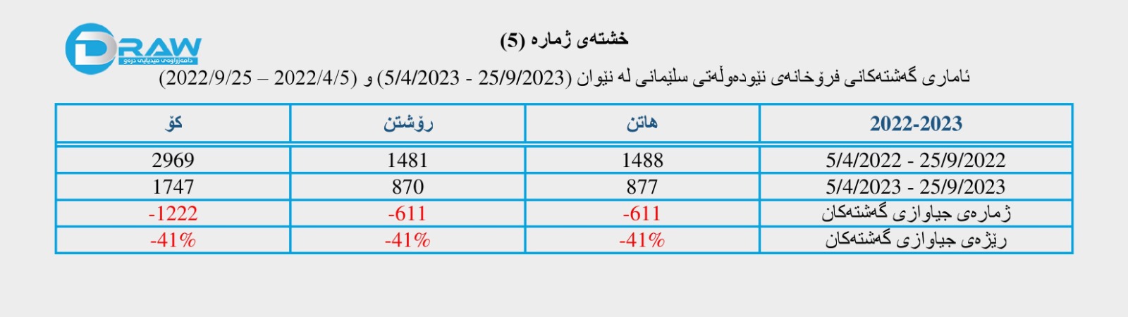 لەم ڕاپۆرتەدا پاڵپشت بە چاودێری کردن (رصد)ی خشتەی رۆژانەی گەشتەکانی فرۆکەخانەی نێودەوڵەتی سلێمانی لە (5/4/2023 – 25/9/2023)، تیشک دەخەینە سەر ژمارەی ئەو گەشتانەی لە فرۆکەخانەی نێودەوڵەتی سلێمانی ئەنجام دراون، پاشان بەراوردی دەکەین بە ژمارەی ئەو گەشتانەی کە لە هەمان ماوەی ساڵی رابردوو ئەنجام دراون، پاشان قەبارەی دابەزینی ژمارەی گەشتەکان روندەکەینەوە.